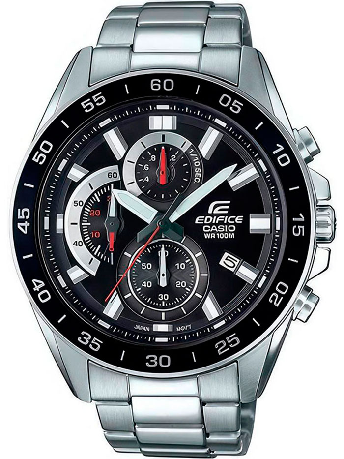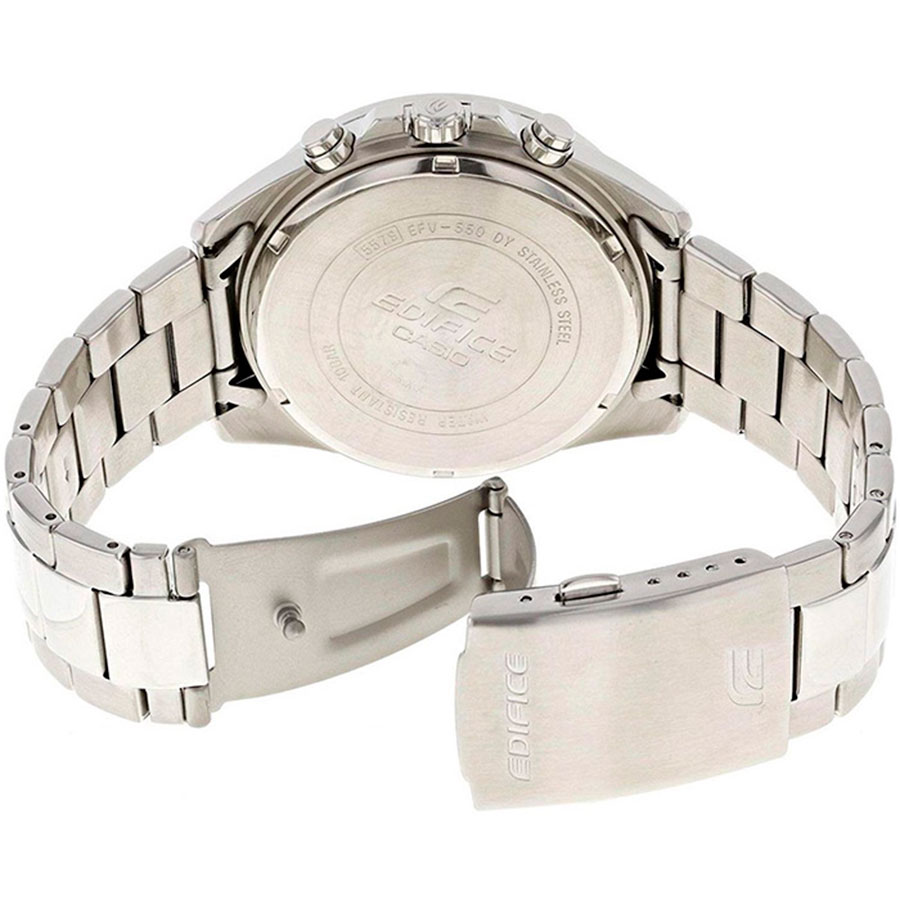 Мужские кварцевые наручные часы с хронографом (секундомером) Casio EFV-550D-1A. Коллекция Edifice. Калибр механизма — 5579. На данной модели отображается дата. Секундомер может отсчитывать до 59 минут 59 секунд с точностью 1/10 секунды. Стрелки и метки покрыты люминесцентным напылением (светятся в темноте). На корпус частично нанесено стойкое PVD покрытие. Завинчивающаяся задняя крышка. Водонепроницаемость WR100 (10 атм).  Размеры корпуса: (ШхВхТ) 47x53x12.1 мм Гарантийный срок — 3 года (1 год от производителя + 2 года от магазина).