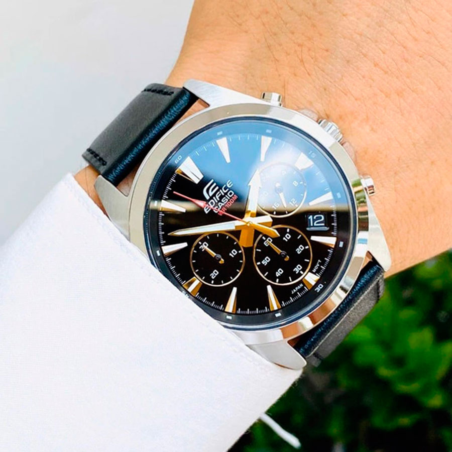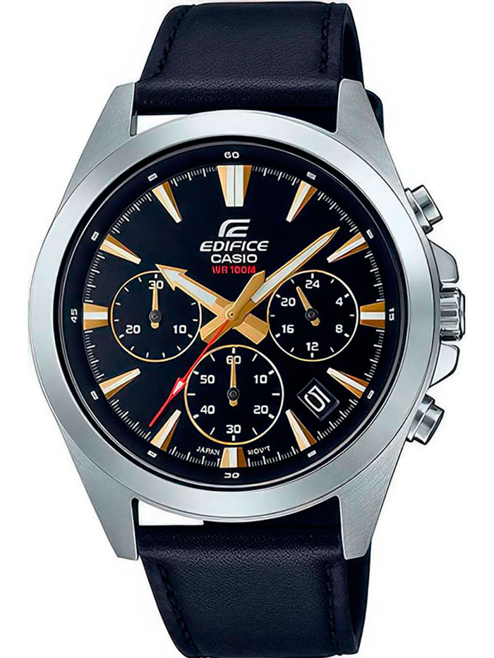 Мужские кварцевые наручные часы с хронографом (секундомером) Casio EFV-630L-1A. Коллекция Edifice. Калибр механизма — 5434. На данной модели отображается дата и время суток в 24-х часовом формате. Секундомер может отсчитывать до 29 минут 59 секунд с точностью 1 секунда. Стрелки и метки покрыты люминесцентным напылением (светятся в темноте). Завинчивающаяся задняя крышка. Кожаный ремешок. Водонепроницаемость WR100 (10 атм).  Размеры корпуса: (ШхВхТ) 43.9x49.5x10.8 мм Гарантийный срок — 3 года (1 год от производителя + 2 года от магазина).