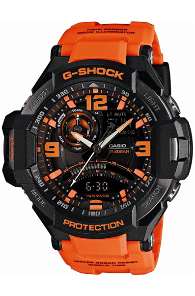 Противоударные кварцевые мужские наручные часы Casio GA-1000-4A коллекции G-Shock Gravitymaster с компасом и термометром. Эта модель из серии G-Shock Gravitymaster для пилотов, работающих в суровых условиях. Калибр механизма — 5302. Функциональность данной модели: формат времени 12/24, автоматический календарь до 2099 года, функция летнего времени (DST), мировое время 48 городов (31 часовой пояс), двойное время, 5 независимых будильников, сигнал начала часа, секундомер с точностью 1/100 секунды и измерением до 24 часов, таймер обратного отсчета (диапазон времени 60 минут), неоновая (светодиод черного цвета) подсветка циферблата с функцией авто (включается при наклоне часов на 40°) и возможностью выбора времени свечения (1.5 или 3 секунды), цифровой компас, термометр для измерения температуры окружающей среды, функция перемещения стрелок (помогает определить значения в окошке с цифровой индикацией, когда стрелки его закрывают), функция выключения звука нажатия кнопок (Mute), функция предупреждение о низком заряде батареи. Стрелки и метки покрыты необритовым (Neobrite) люминесцентным напылением (светятся в темноте). Сферическое минеральное стекло. Корпус изготовлен из нержавеющей стали и пластика. На стальную часть корпуса нанесено стойкое PVD покрытие. Полимерный ремешок. Водонепроницаемость WR200 (20 атм). Размеры корпуса: (ШxВxТ) 52.1x50.8x16.9 мм. Гарантийный срок — 3 года (1 год от производителя + 2 года от магазина).