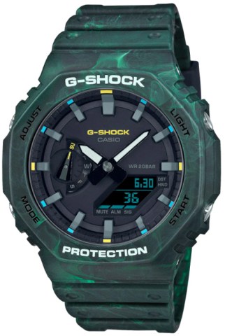 Противоударные кварцевые мужские наручные часы Casio GA-2110SU-3A коллекции G-Shock с цифровой+стрелочной индикацией времени. Тонкий корпус для данной коллекции — 11.8 мм. Калибр механизма — 5611. Корпус усилен углеродным волокном. Функциональность данной модели: формат времени 12/24, автоматический календарь до 2099 года, функция летнего времени (DST), мировое время 48 городов (29 часовых поясов), 5 независимых будильников, сигнал начала часа, секундомер с точностью 1/100 секунды и измерением до 23 часов 59 минут 59 cек., таймер обратного отсчета (диапазон времени 24 часа), диодная подсветка циферблата, функция выключения звука кнопок (Mute), смещение стрелок для удобного просмотра информации на цифровом экране. Водонепроницаемость WR200 (20 атм). Размеры корпуса: (ШxВxТ) 45.4x48.5x11.8 мм. Гарантийный срок — 3 года (1 год от производителя + 2 года от магазина).
