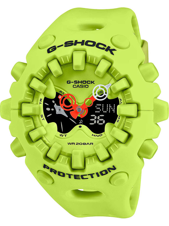 Размер корпуса 58.2×49.1×19.6 мм. делает модель заметной на запястье, а водозащита WR200 позволяет использовать часы при плавании и экстремальных водных нагрузках. Батарейка рассчитана на 10 лет работы, что делает Casio GA-V01-9A надежным аксессуаром на долгие годы.