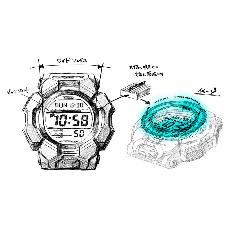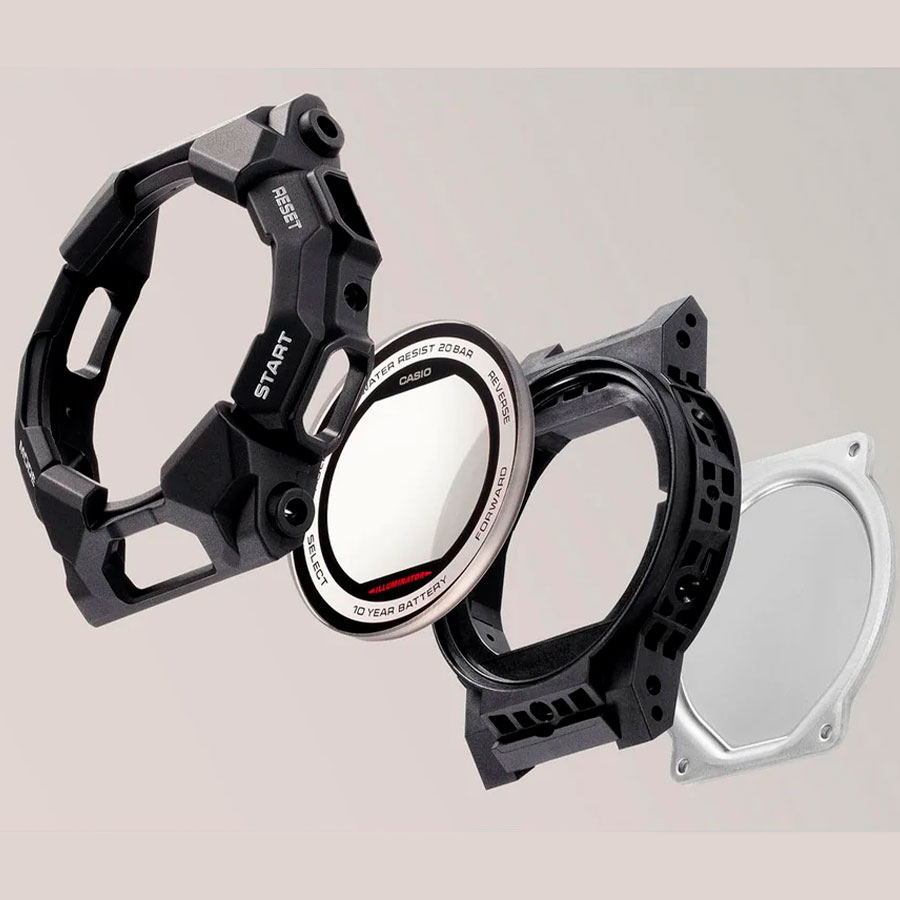 Корпус модели усилен углеродным волокном по технологии Carbon Core Guard, что делает конструкцию особенно устойчивой к ударам и внешним воздействиям. Подсветка Super Illuminator с автоматическим включением при наклоне часов обеспечивает отличную читаемость экрана в темноте. Дополнительно предусмотрены 5 независимых будильников, секундомер с точностью 1/100 секунды, таймер обратного отсчета и функция Mute для отключения звука кнопок.