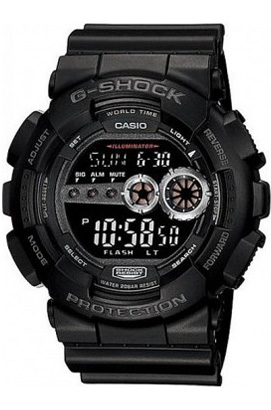 Противоударные кварцевые мужские наручные часы Casio GD-100-1B коллекции G-Shock с цифровой индикацией времени. Калибр механизма — 3263. Функциональность данной модели: формат времени 12/24, автоматический календарь до 2099 года, функция летнего времени (DST), мировое время 48 городов (31 часовой пояс), 5 независимых будильников, сигнал начала часа, секундомер с точностью 1/100 секунды и измерением до 23 часов 59 минут 59,99 cек., таймер обратного отсчета (диапазон времени 24 часа), диодная подсветка циферблата с функцией авто (включается при наклоне часов на 40°), функция выключения звука кнопок (Mute). Водонепроницаемость WR200 (20 атм). Размеры корпуса: Диаметр 50.5 мм; толщина 16.5 мм Гарантийный срок — 3 года (1 год от производителя + 2 года от магазина).