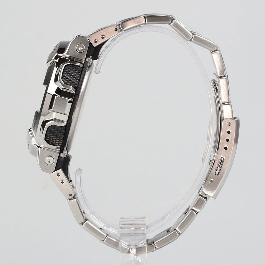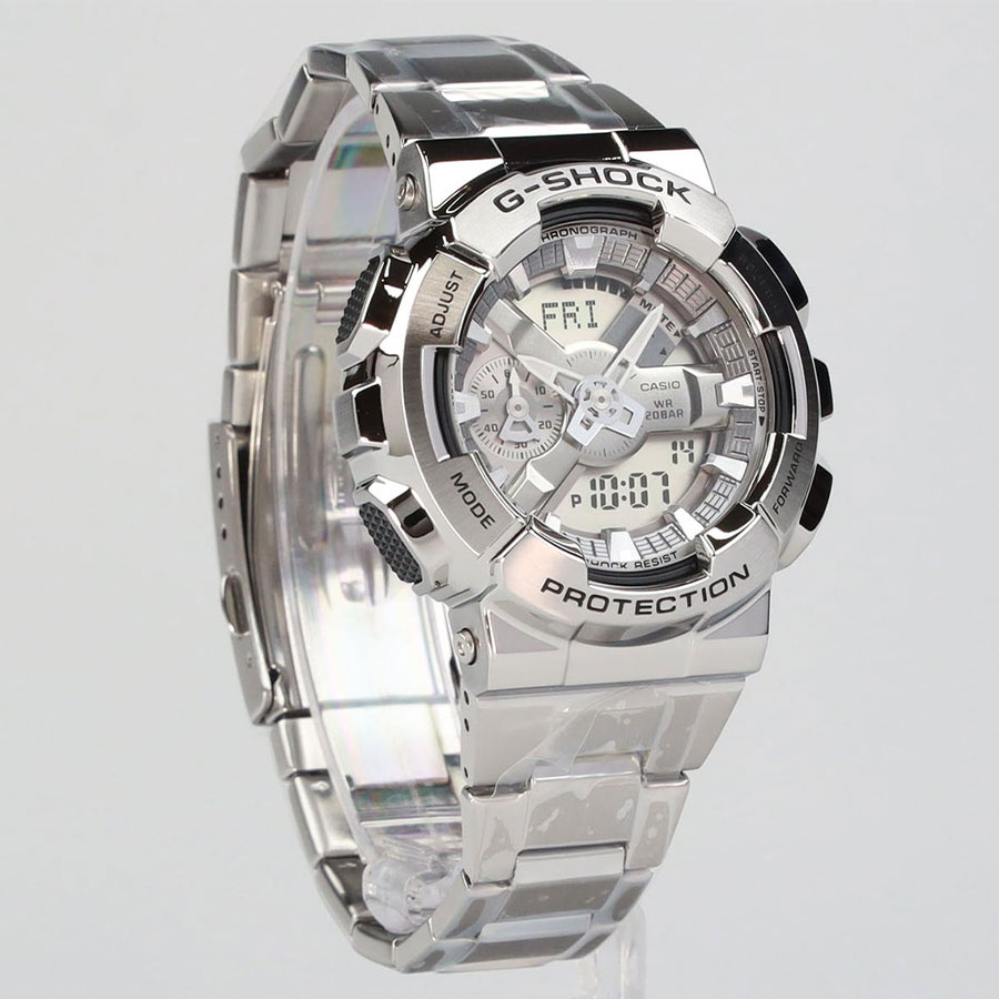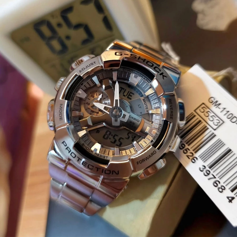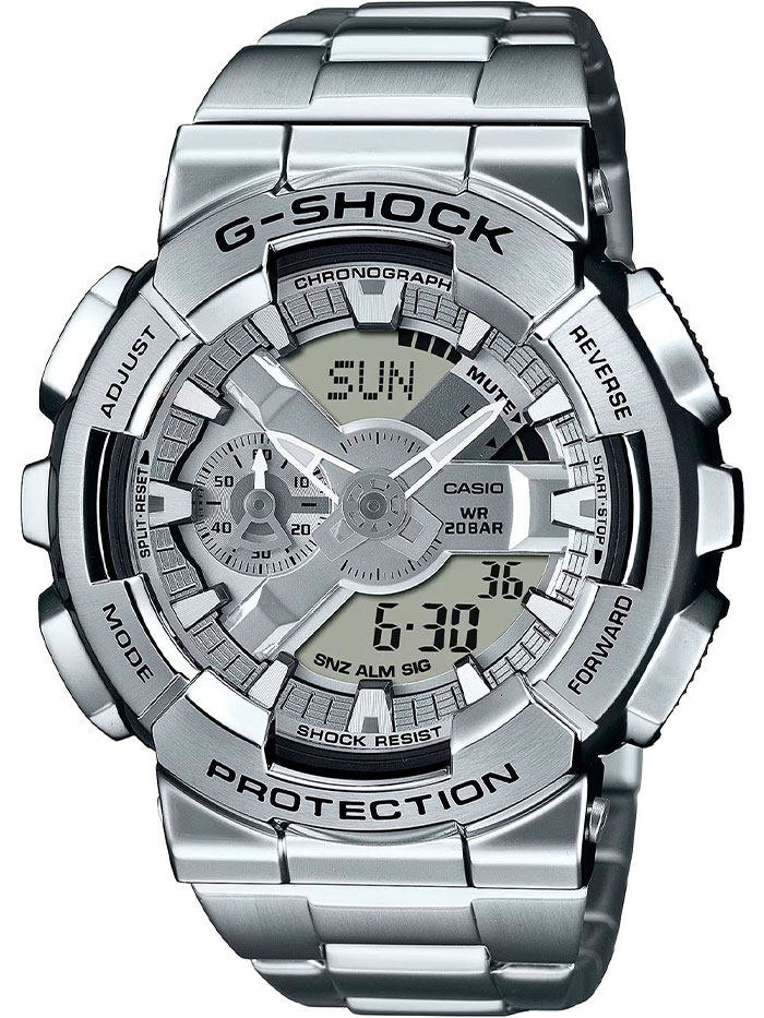 Противоударные кварцевые наручные часы Casio GM-110D-8A коллекции G-Shock с цифровой+стрелочной индикацией времени. Калибр механизма — 5553. Функциональность данной модели: формат времени 12/24, автоматический календарь до 2099 года, функция летнего времени (DST), мировое время в 48 городах (31 часовой пояс), 5 независимых будильников, сигнал начала часа, секундомер с точностью 1/100 секунды и измерением до 999 часов 59 минут 59,99 cек., таймер обратного отсчета (диапазон времени 24 часа). Функция выключения звука нажатия кнопок (Mute). Диодная подсветка циферблата с функцией авто (включается при наклоне часов на 40°) и возможностью выбора времени свечения (1.5 или 3 секунды). Стрелки покрыты необритовым (Neobrite) люминесцентным напылением (светятся в темноте). Пластиковый корпус в оболочке из нержавеющей стали. Стальной браслет. Водонепроницаемость WR200 (20 атм). Размеры корпуса: (ШхВхТ) 48.8x51.9x16.9 мм. Гарантийный срок — 3 года (1 год от производителя + 2 года от магазина).