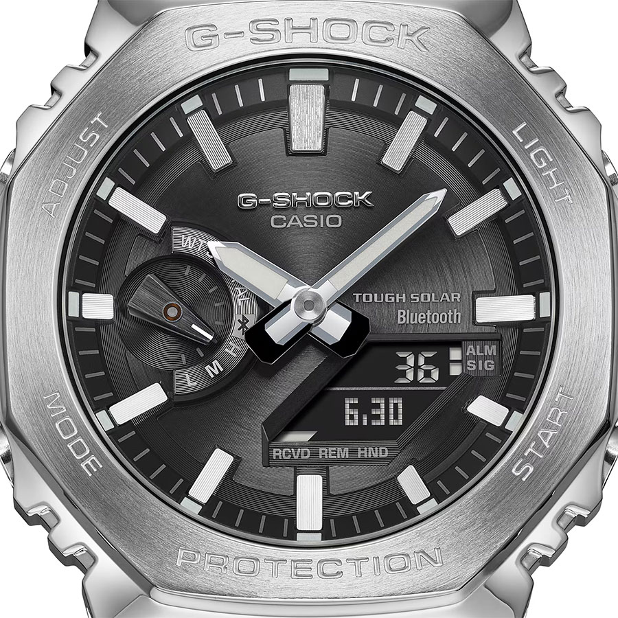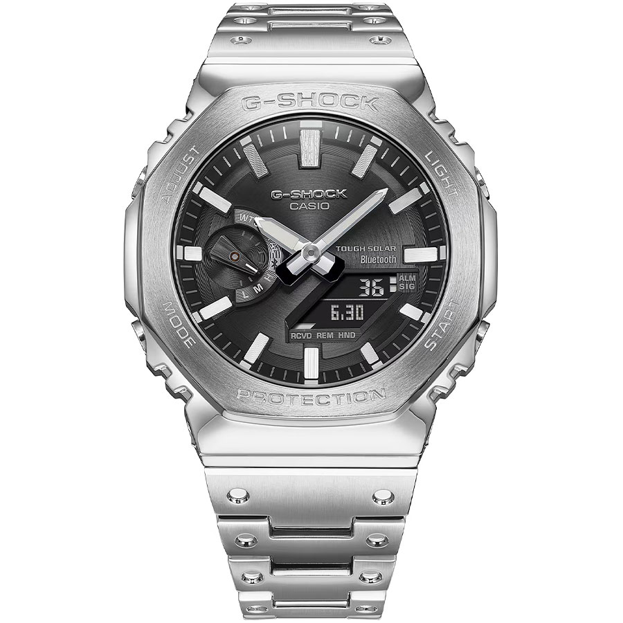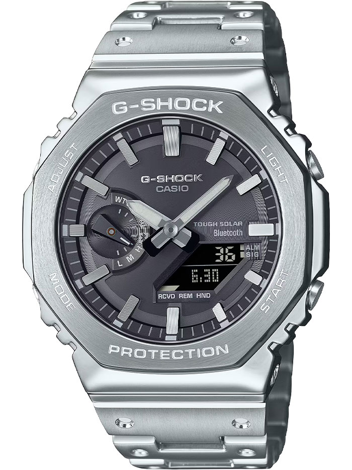 Мужские противоударные кварцевые наручные часы японского производства на солнечной батарее Casio GM-B2100SD-1A коллекции G-Shock с цифровой+стрелочной индикацией времени с модулем Bluetooth® Smart. Калибр механизма — 5691. Аккумулятор данной модели заряжается от любого источника света. Срок работы аккумулятора с полным зарядом — около 7-ми месяцев при обычном использовании без воздействия света после зарядки и 18 месяцев при хранении в полной темноте с включенной функцией энергосбережения после полной зарядки. Имеется режим энергосбережения (дисплей гаснет для экономии энергии, когда часы остаются в темноте). Примерный срок службы аккумулятора — не менее 10 лет. Корпус выполнен из нержавеющей стали. С помощью Bluetooth® вы можете подключить часы к смартфону и с помощью приложения CASIO WATCHES получить доступ к полезным функциям. Часы автоматически связываются с телефоном через Bluetooth® и проверяют точность времени 4 раза в сутки. Функция поиска телефона, можно включить тоновый сигнал на телефоне, что позволит быстро найти телефон. Настройка и управление таймером, секундомером и будильником. Установка напоминания. Запись текущего местоположения (TIME and PLACE). Можно проверить уровень заряда аккумулятора. Функциональность данной модели: формат времени 12/24, автоматический календарь до 2099 года, возможность установки индикации дня недели на одном из шести языков (в том числе на русском), функция летнего времени (DST), мировое время в 38 городах (38 часовых поясов), 5 независимых будильников, сигнал начала часа, секундомер с точностью 1/100 секунды и измерением до 59 минут 59 cек., таймер обратного отсчета (диапазон времени 60 минут) с шагом 1 сек., двойная сверхяркая диодная подсветка циферблата с возможностью выбора времени свечения (1.5 или 3 секунды), функция выключения звука нажатия кнопок (Mute), функция смещения стрелок для удобного просмотра информации на цифровом экране, функция поиска телефона (при нажатии кнопки на ваших часах смартфон подает звуковой сигнал). Стрелки и метки покрыты необритовым (Neobrite) люминесцентным напылением (светятся в темноте). Модуль часов снабжен элементами из материала alphaGEL, который еще лучше защищает часы от сотрясения и вибрации. AlphaGEL представляет собой гибкую силиконовую прослойку, оказывающую амортизирующий эффект. Циферблат, создан по технологии тонкой обработки от Yamagata Casio, сочетается с индексами, покрытыми серебром методом напыления, что обеспечивает привлекательный дизайн и удобство считывания. Завинчивающаяся задняя крышка часов. Литой стальной браслет. Водонепроницаемость WR200 (20 атм). Японская сборка (Made In Japan). Размеры корпуса: (ШxВxТ) 44.4x49.8x12.8 мм. Гарантийный срок — 3 года (1 год от производителя + 2 года от магазина).