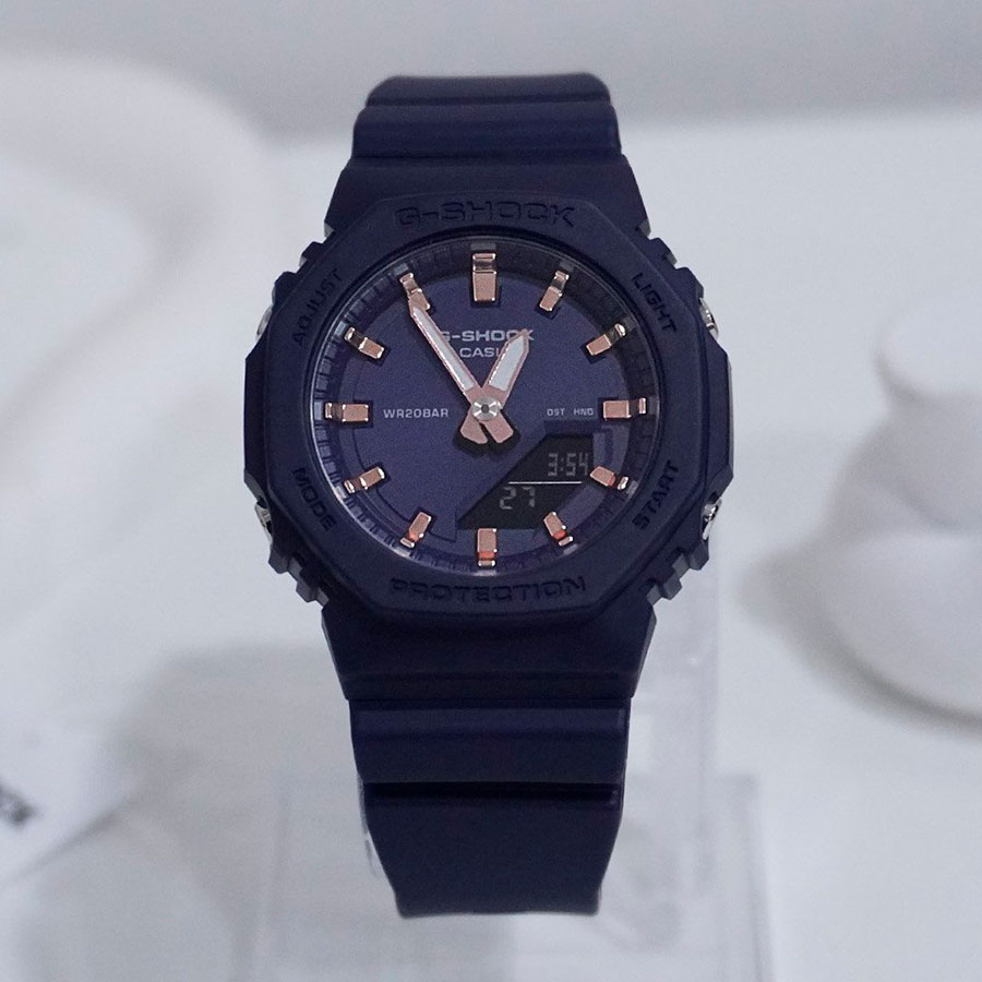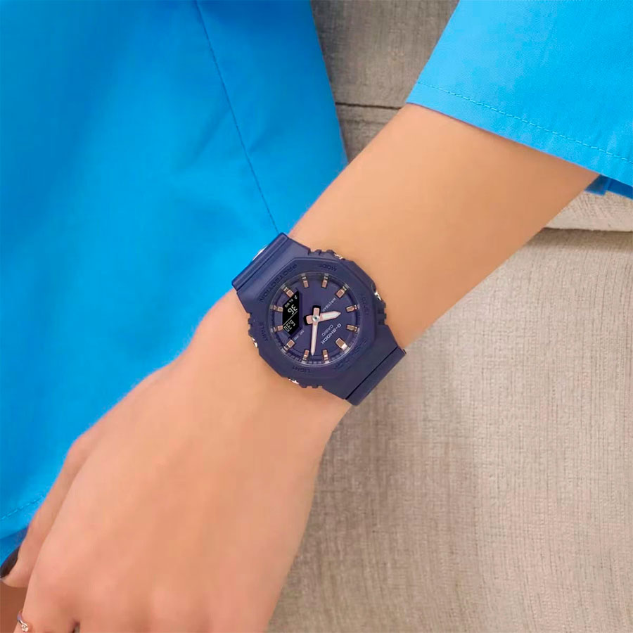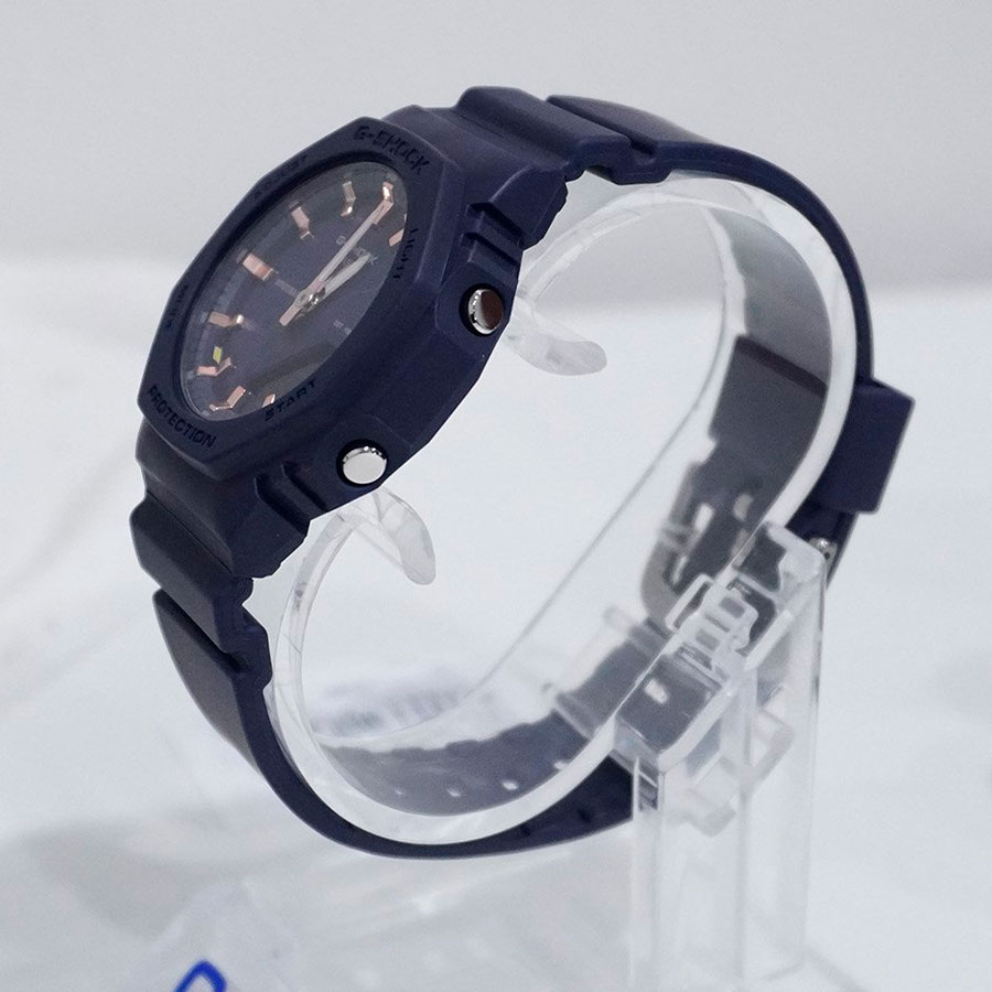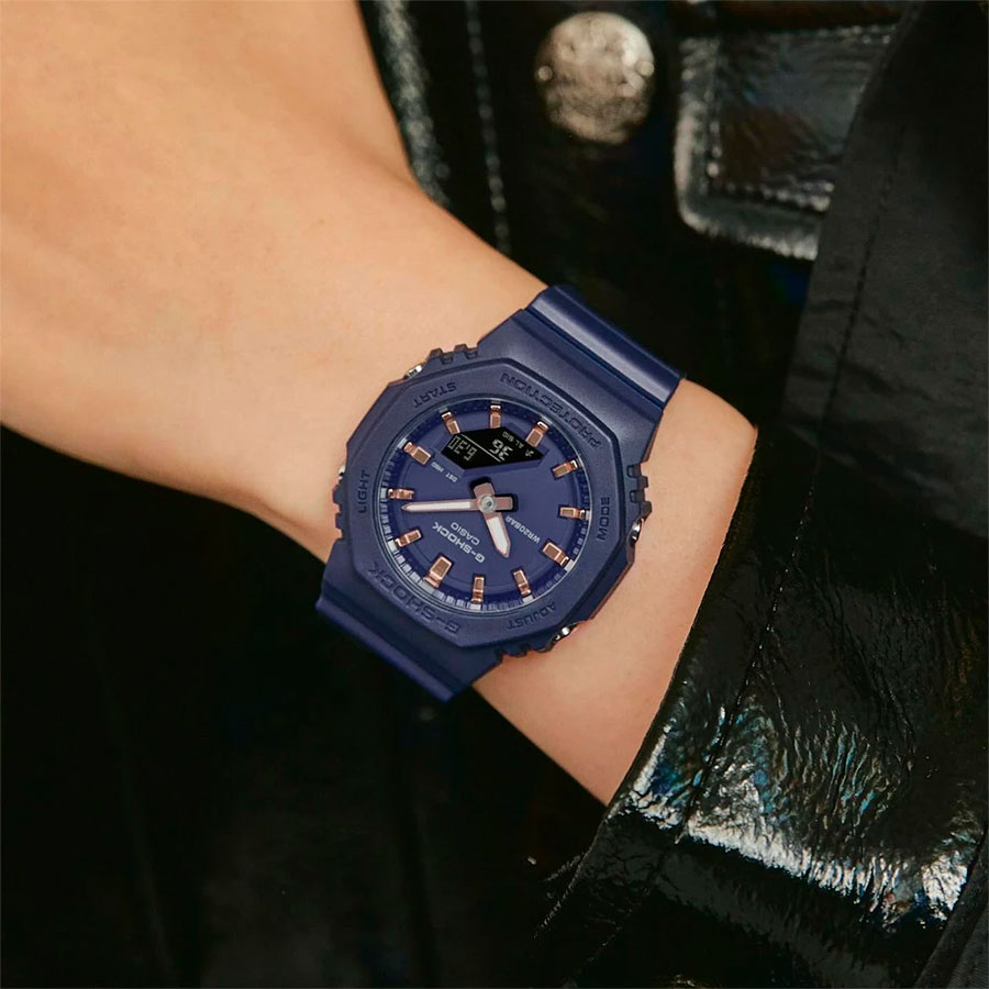 Противоударные женские кварцевые наручные часы Casio GMA-P2100M-2A коллекции G-Shock с цифровой+стрелочной индикацией времени. Тонкий корпус для данной коллекции — 11.2 мм. GMA-P2100 повторяет и без того компактный дизайн GMA-S2100, но сделаны еще тоньше и компактнее, а также за счет более короткой длины ремешка позволяет с максимальным комфортом носить на запястьях меньшего размера. Калибр механизма — 5730. Функциональность данной модели: формат времени 12/24, автоматический календарь до 2099 года, функция летнего времени (DST), мировое время в 48 городах (31 часовой пояс), 5 независимых будильников, сигнал начала часа, секундомер с точностью 1/100 секунды и измерением до 23 часов 59 минут 59 cек., таймер обратного отсчета (диапазон времени 24 часа), двойная диодная подсветка циферблата с возможностью выбора времени свечения (1.5 или 3 секунды) + необритовое (Neobrite) покрытие на стрелках для длительного послесвечения в темноте, функция выключения звука нажатия кнопок (Mute), функция смещения стрелок для удобного просмотра информации на цифровом экране. Водонепроницаемость WR200 (20 атм). Размеры корпуса: (ШxВxТ) 40.2x46x11.2 мм. Гарантийный срок — 3 года (1 год от производителя + 2 года от магазина).