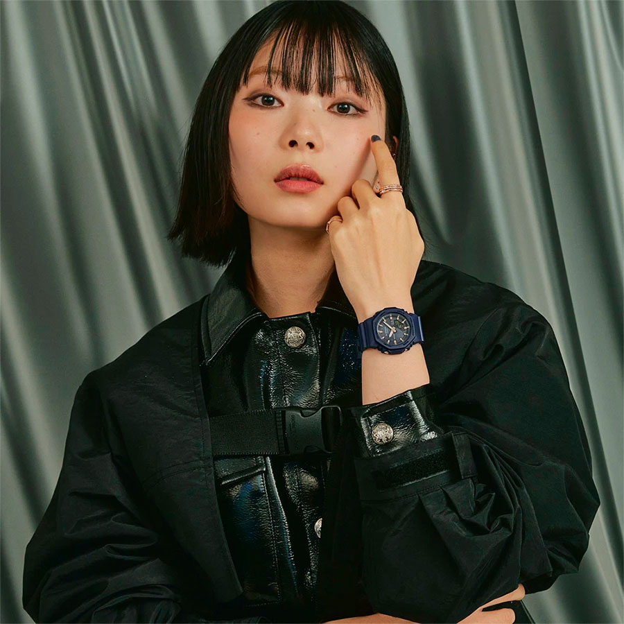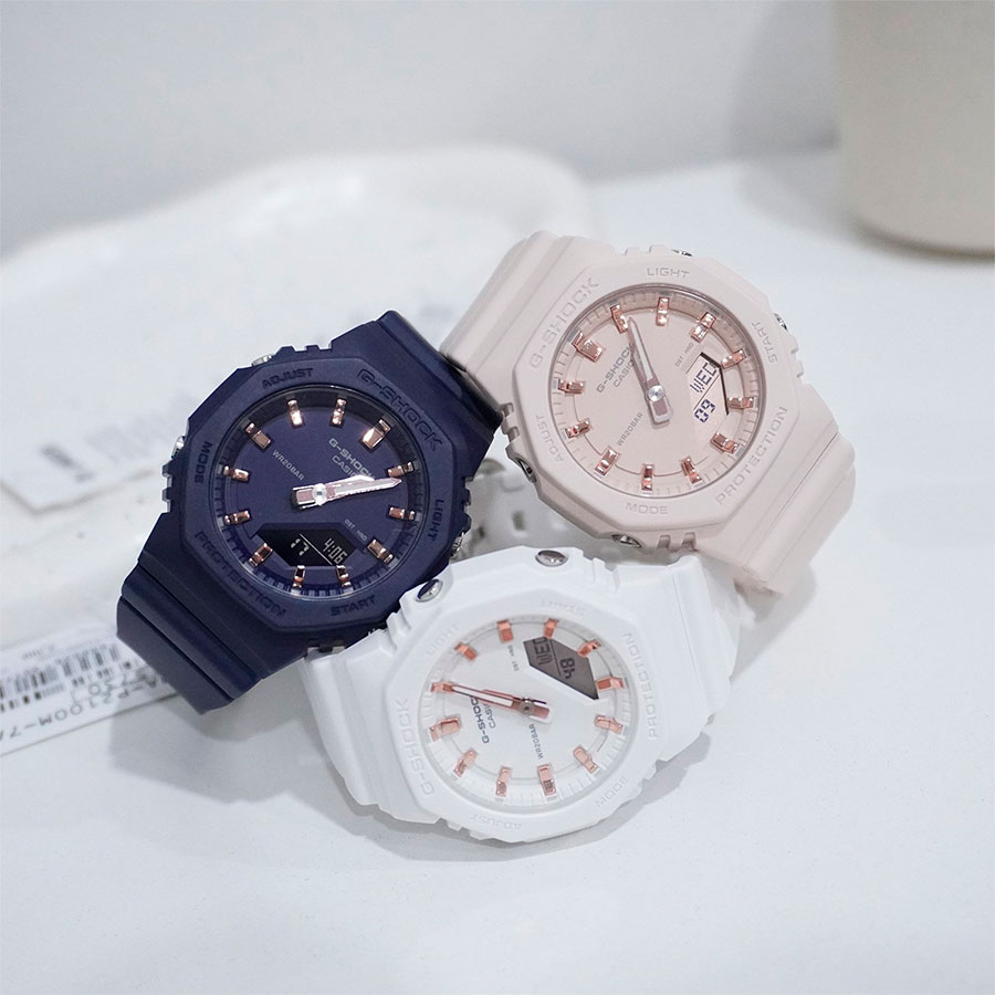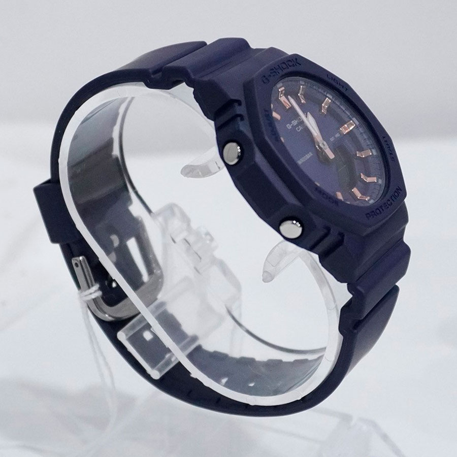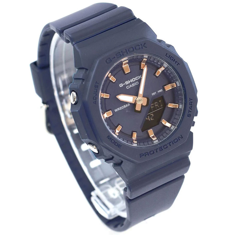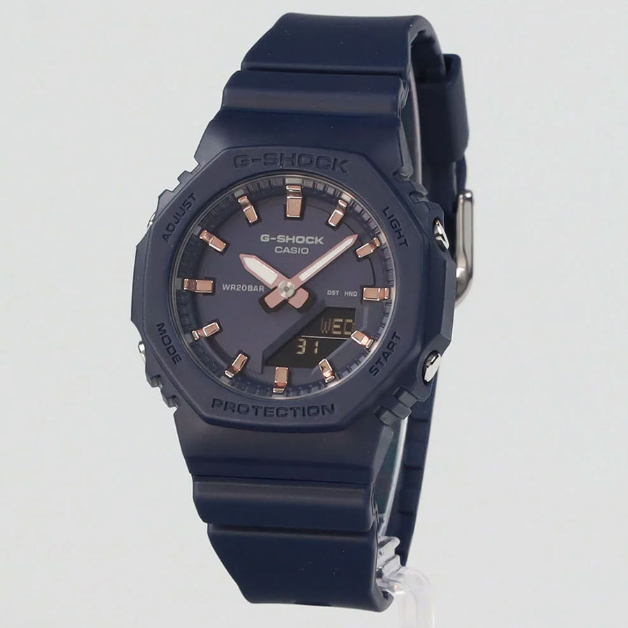 Противоударные женские кварцевые наручные часы Casio GMA-P2100M-2A коллекции G-Shock с цифровой+стрелочной индикацией времени. Тонкий корпус для данной коллекции — 11.2 мм. GMA-P2100 повторяет и без того компактный дизайн GMA-S2100, но сделаны еще тоньше и компактнее, а также за счет более короткой длины ремешка позволяет с максимальным комфортом носить на запястьях меньшего размера. Калибр механизма — 5730. Функциональность данной модели: формат времени 12/24, автоматический календарь до 2099 года, функция летнего времени (DST), мировое время в 48 городах (31 часовой пояс), 5 независимых будильников, сигнал начала часа, секундомер с точностью 1/100 секунды и измерением до 23 часов 59 минут 59 cек., таймер обратного отсчета (диапазон времени 24 часа), двойная диодная подсветка циферблата с возможностью выбора времени свечения (1.5 или 3 секунды) + необритовое (Neobrite) покрытие на стрелках для длительного послесвечения в темноте, функция выключения звука нажатия кнопок (Mute), функция смещения стрелок для удобного просмотра информации на цифровом экране. Водонепроницаемость WR200 (20 атм). Размеры корпуса: (ШxВxТ) 40.2x46x11.2 мм. Гарантийный срок — 3 года (1 год от производителя + 2 года от магазина).