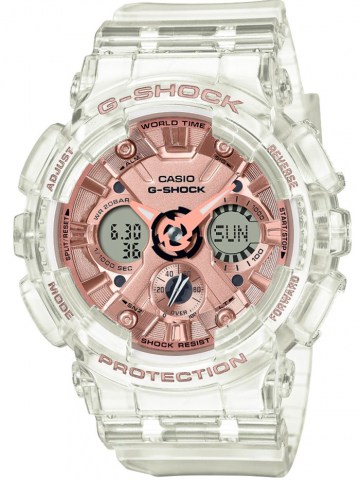 Противоударные кварцевые наручные часы Casio GMA-S120RB-1A коллекции G-Shock цифровой+стрелочной индикацией времени. Калибр механизма — 5518. Функциональность данной модели: формат времени 12/24, автоматический календарь до 2099 года, функция летнего времени (DST), мировое время в 48 городах (29 часовых поясов), 5 независимых будильников, сигнал начала часа, секундомер с точностью 1/1000 секунды и измерением до 99 часов 59 минут 59,99 cек., функция расчета средней скорости движения, таймер обратного отсчета (диапазон времени 24 часа), диодная подсветка циферблата с функцией авто (включается при наклоне часов на 40°) и возможностью выбора времени свечения (1.5 или 3 секунды) + необритовое (Neobrite) покрытие на стрелках для длительного послесвечения в темноте. Водонепроницаемость WR200 (20 атм). Размеры корпуса: (ШxВxТ) 45.9x49x15.8 мм. Гарантийный срок — 3 года (1 год от производителя + 2 года от магазина).