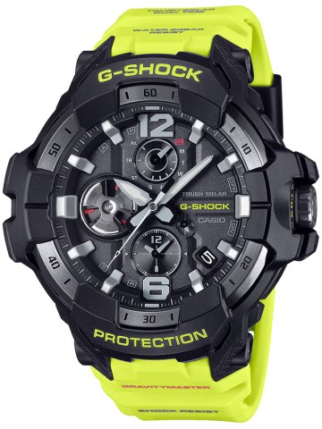 Противоударные кварцевые наручные часы на солнечной батарее Casio GR-B300-8A2 коллекции G-Shock Gravitymaster со стрелочной индикацией времени и модулем Bluetooth® Smart. Эта модель из серии G-Shock Gravitymaster специально разработанна для пилотов, работающих в суровых условиях. Калибр механизма — 5719. Аккумулятор данной модели заряжается от любого источника света. Срок работы аккумулятора с полным зарядом — около 5-ти месяцев при обычном использовании без воздействия света после зарядки и 18 месяцев при хранении в полной темноте с включенной функцией энергосбережения после полной зарядки. Примерный срок службы аккумулятора — 10 лет. Имеется режим энергосбережения (стрелки останавливаются для экономии энергии, когда часы остаются в темноте) и индикатор уровня заряда батареи. С помощью Bluetooth® вы можете подключить часы к смартфону и с помощью приложения CASIO WATCHES получить доступ к полезным функциям. Часы автоматически связываются с телефоном через Bluetooth® и проверяют точность времени 4 раза в сутки. Функция поиска телефона, можно включить тоновый сигнал на телефоне, что позволит быстро найти телефон. Настройка и управление таймером, секундомером и будильником. Можно проверить уровень заряда аккумулятора. Простая настройка мирового времени (приблизительно 300 городов).