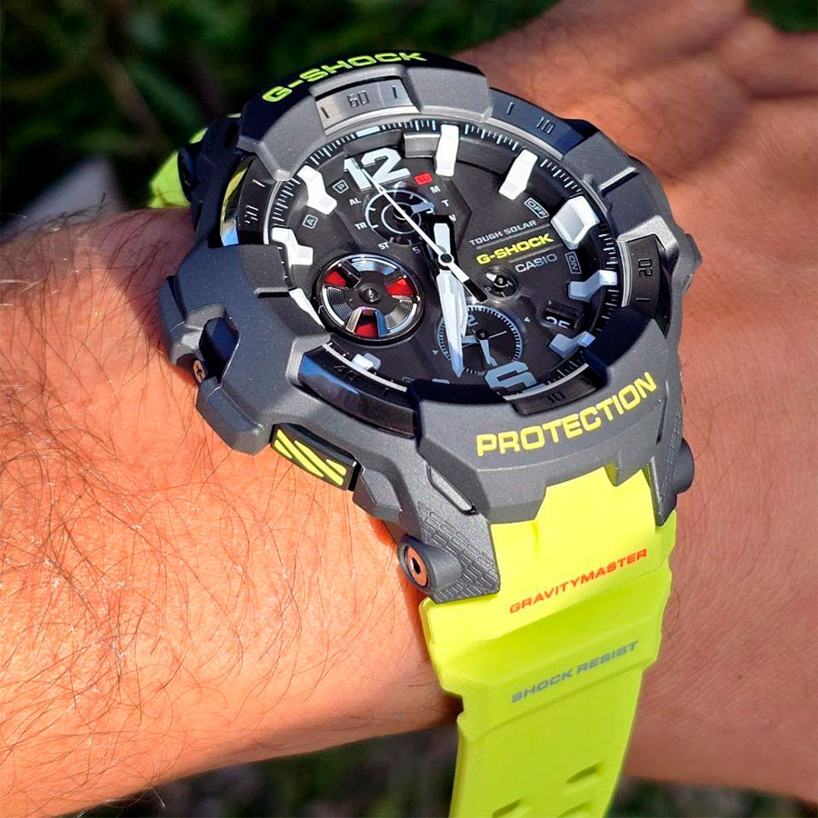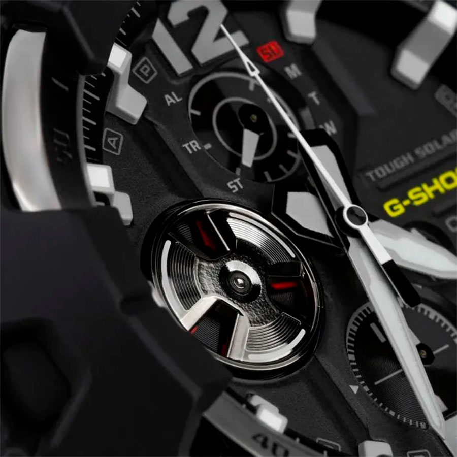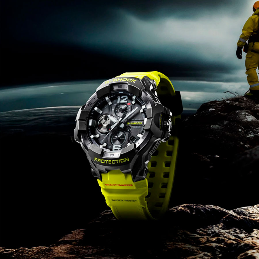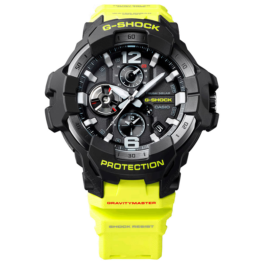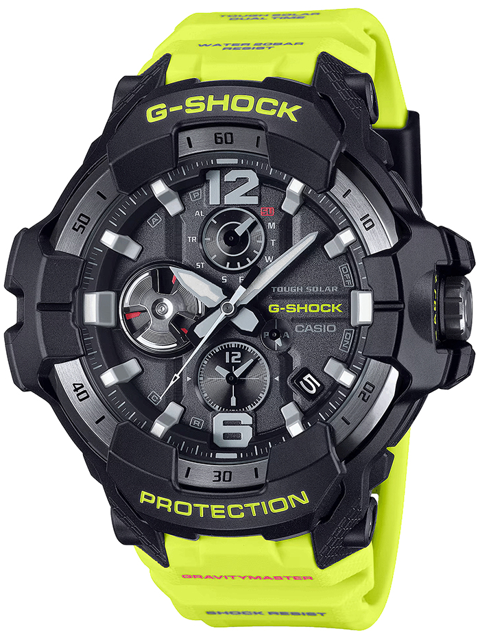 Противоударные кварцевые наручные часы на солнечной батарее Casio GR-B300RY-1A9 коллекции G-Shock Gravitymaster со стрелочной индикацией времени и модулем Bluetooth® Smart. Эта модель из серии G-Shock Gravitymaster специально разработанна для пилотов, работающих в суровых условиях. Калибр механизма — 5719. Аккумулятор данной модели заряжается от любого источника света. Срок работы аккумулятора с полным зарядом — около 5-ти месяцев при обычном использовании без воздействия света после зарядки и 18 месяцев при хранении в полной темноте с включенной функцией энергосбережения после полной зарядки. Примерный срок службы аккумулятора — 10 лет. Имеется режим энергосбережения (стрелки останавливаются для экономии энергии, когда часы остаются в темноте) и индикатор уровня заряда батареи. С помощью Bluetooth® вы можете подключить часы к смартфону и с помощью приложения CASIO WATCHES получить доступ к полезным функциям. Часы автоматически связываются с телефоном через Bluetooth® и проверяют точность времени 4 раза в сутки. Функция поиска телефона, можно включить тоновый сигнал на телефоне, что позволит быстро найти телефон. Настройка и управление таймером, секундомером и будильником. Можно проверить уровень заряда аккумулятора. Простая настройка мирового времени (приблизительно 300 городов).