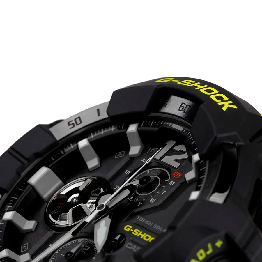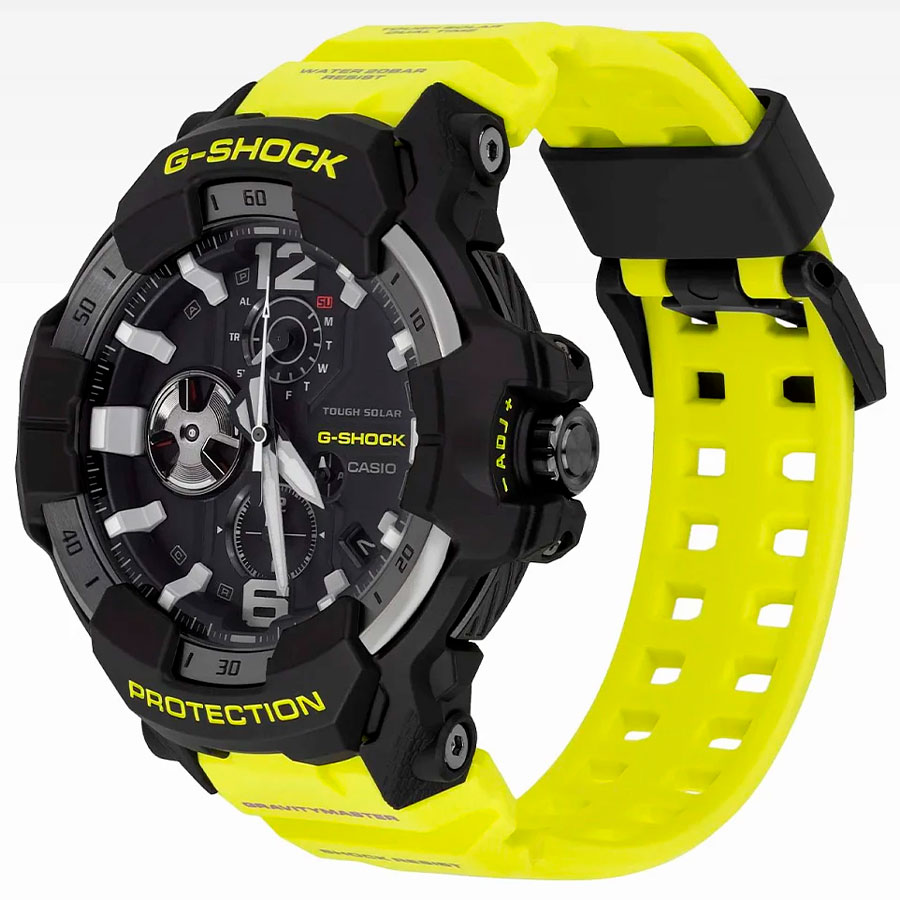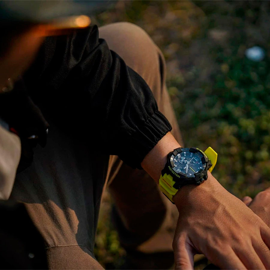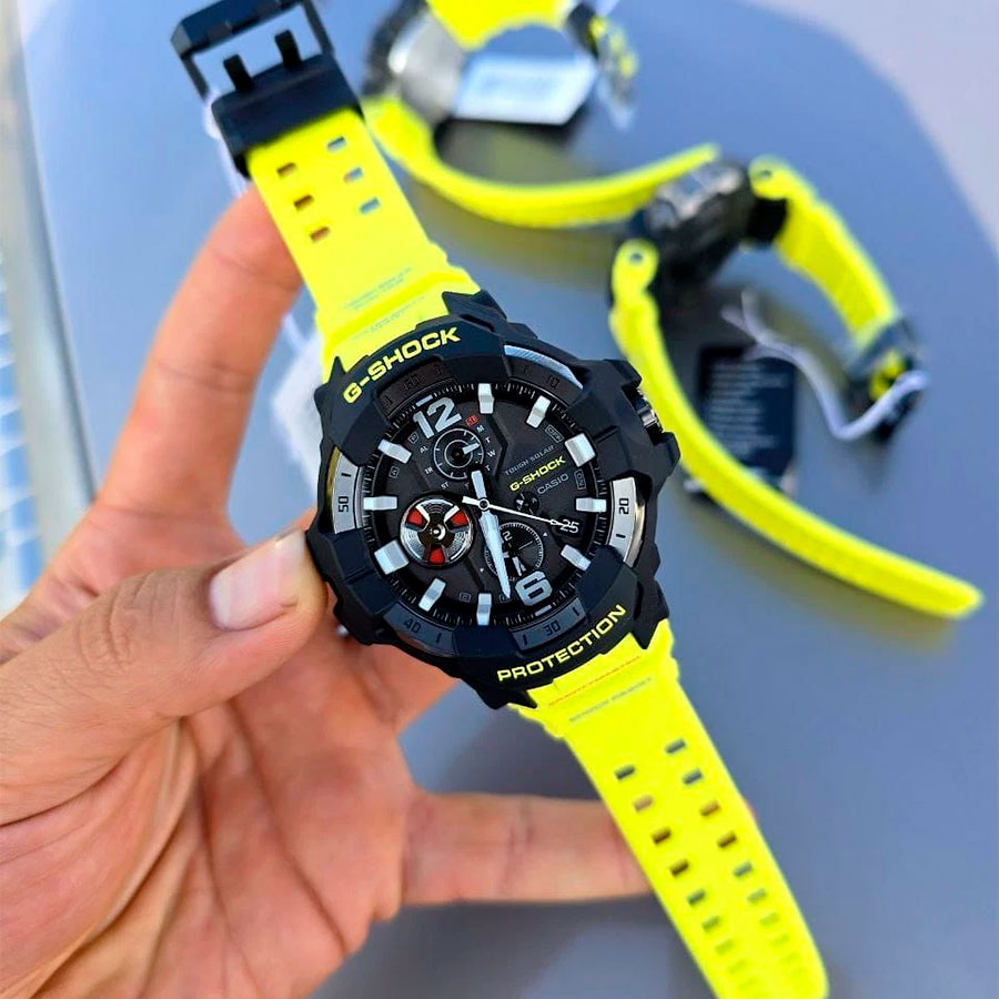 Противоударные кварцевые наручные часы на солнечной батарее Casio GR-B300RY-1A9 коллекции G-Shock Gravitymaster со стрелочной индикацией времени и модулем Bluetooth® Smart. Эта модель из серии G-Shock Gravitymaster специально разработанна для пилотов, работающих в суровых условиях. Калибр механизма — 5719. Аккумулятор данной модели заряжается от любого источника света. Срок работы аккумулятора с полным зарядом — около 5-ти месяцев при обычном использовании без воздействия света после зарядки и 18 месяцев при хранении в полной темноте с включенной функцией энергосбережения после полной зарядки. Примерный срок службы аккумулятора — 10 лет. Имеется режим энергосбережения (стрелки останавливаются для экономии энергии, когда часы остаются в темноте) и индикатор уровня заряда батареи. С помощью Bluetooth® вы можете подключить часы к смартфону и с помощью приложения CASIO WATCHES получить доступ к полезным функциям. Часы автоматически связываются с телефоном через Bluetooth® и проверяют точность времени 4 раза в сутки. Функция поиска телефона, можно включить тоновый сигнал на телефоне, что позволит быстро найти телефон. Настройка и управление таймером, секундомером и будильником. Можно проверить уровень заряда аккумулятора. Простая настройка мирового времени (приблизительно 300 городов).