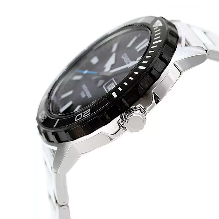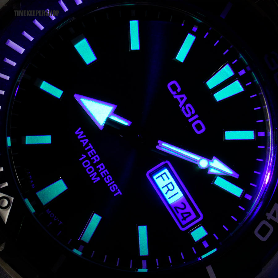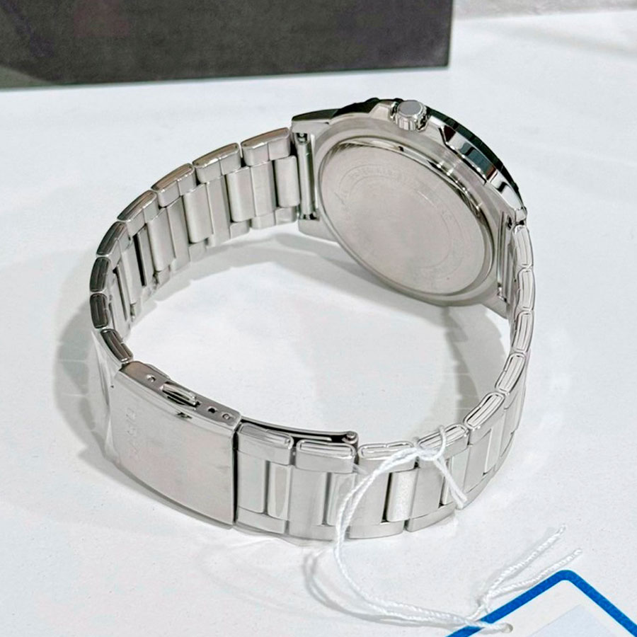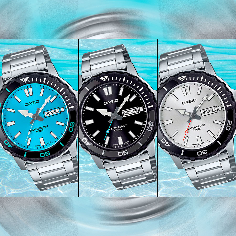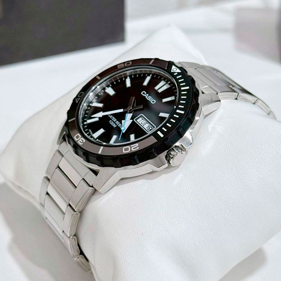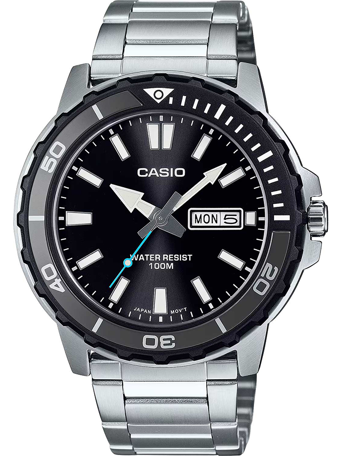 Мужские кварцевые часы Casio MTD-125D-1A3. Калибр механизма — 5716. На циферблате отображается день недели и текущая дата. Стрелки и метки покрыты люминесцентным напылением (светятся в темноте). Стальной браслет. Вращающийся в одном направлении безель из пластика и алюминия. Водонепроницаемость WR100 (10 атм). Размеры корпуса: (ШxВxТ) 45.6x46.5x10.4 мм. Гарантийный срок — 3 года (1 год от производителя + 2 года от магазина).