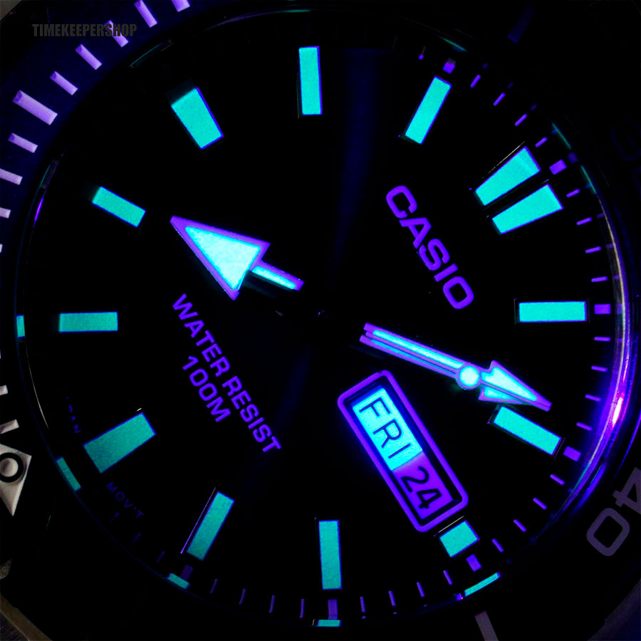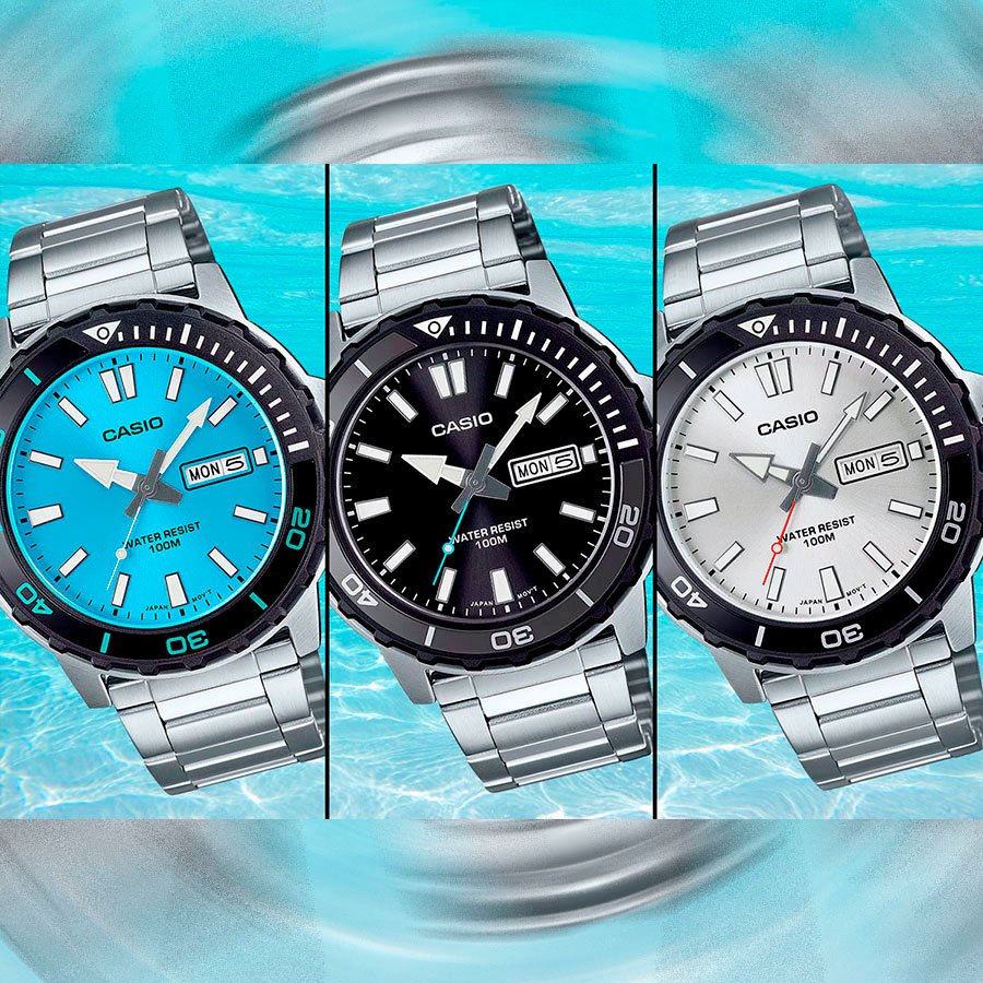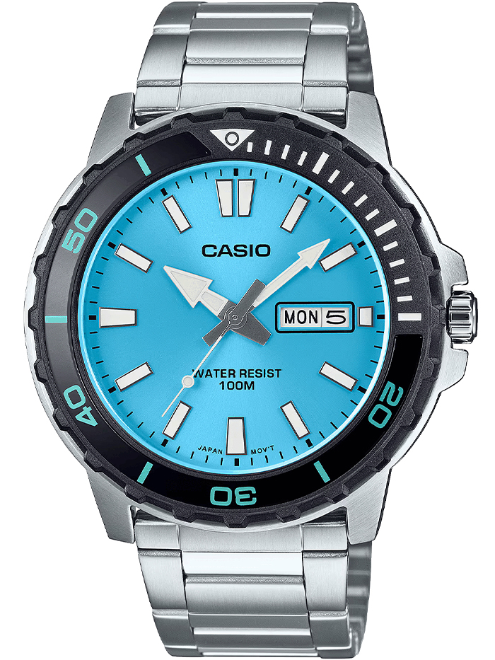 Мужские кварцевые часы Casio MTD-125D-2A3. Калибр механизма — 5716. На циферблате отображается день недели и текущая дата. Стрелки и метки покрыты люминесцентным напылением (светятся в темноте). Стальной браслет. Вращающийся в одном направлении безель из пластика и алюминия. Водонепроницаемость WR100 (10 атм). Размеры корпуса: (ШxВxТ) 45.6x46.5x10.4 мм. Гарантийный срок — 3 года (1 год от производителя + 2 года от магазина).