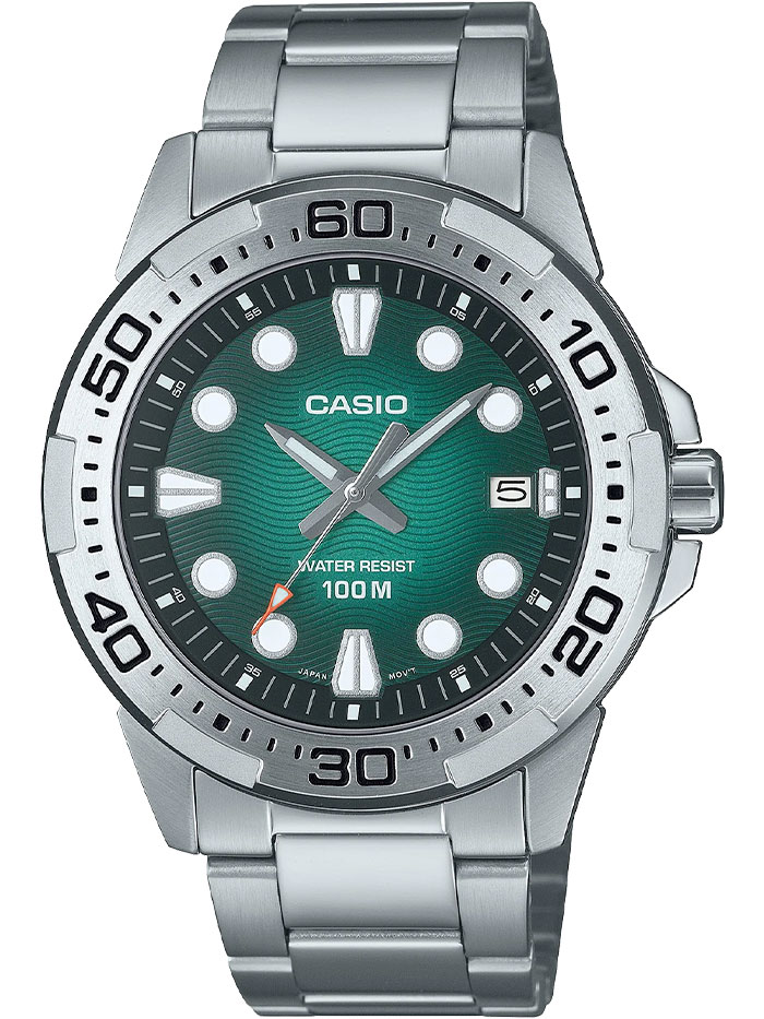 Мужские кварцевые часы Casio MTD-140D-3A. Калибр механизма — 5664. На циферблате отображается текущая дата. Стрелки и метки покрыты люминесцентным напылением (светятся в темноте). Стальной браслет. Водонепроницаемость WR100 (10 атм). Размеры корпуса: (ШxВxТ) 43.7x48.4x9.5 мм. Гарантийный срок — 3 года (1 год от производителя + 2 года от магазина).