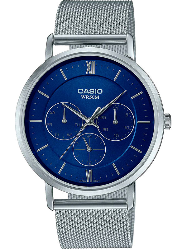 Мужские кварцевые наручные часы Casio MTP-B300M-2A. Калибр механизма — 2364. На данной модели отображается день недели, текущая дата и время суток в 24-х часовом формате. Стальной браслет миланского плетения. Водонепроницаемость WR50 (5 атм). Размеры корпуса: (ШxВxТ) 40x48x8.3 мм. Гарантийный срок — 3 года (1 год от производителя + 2 года от магазина).