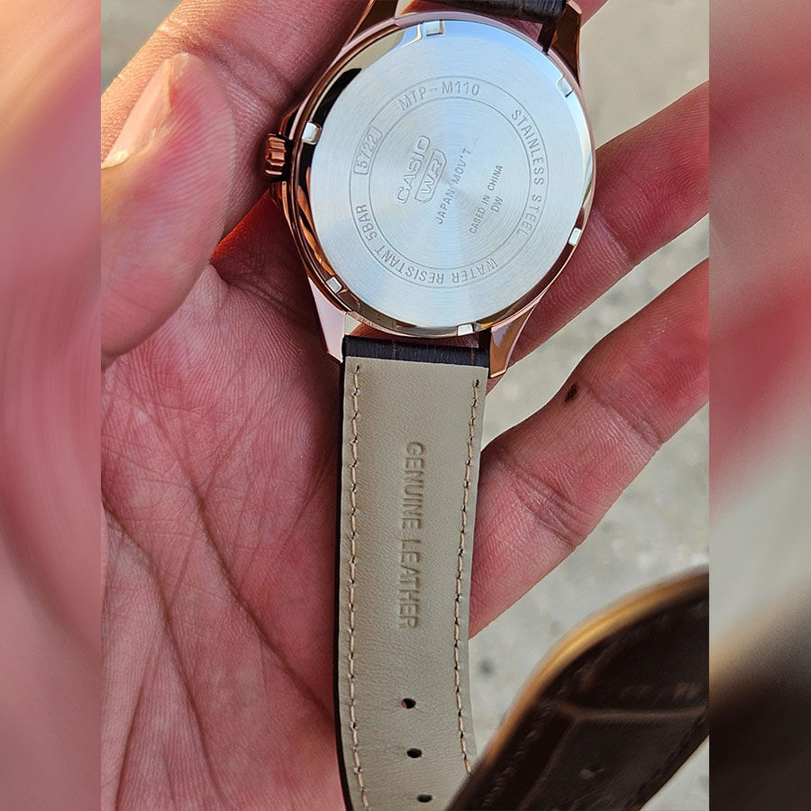 Размер корпуса 42.5×48.4×9.6 мм. делает модель удобной для ежедневного ношения. Водонепроницаемость WR50 (5 атм) защищает часы от дождя и случайных брызг. Casio MTP-M110RL-5A подойдёт тем, кто ценит надёжность, эстетику и комфорт.