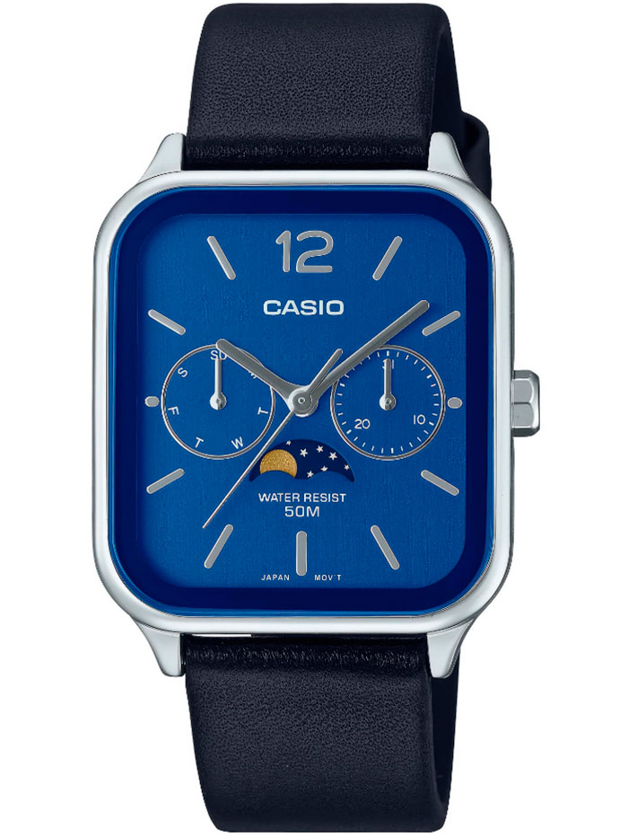 Кварцевые наручные часы Casio MTP-M305L-2A. Калибр механизма — 3744. На данной модели отображается день недели, текущая дата и фаза луны. Ремешок из искусственной кожи. Водонепроницаемость WR50 (5 атм). Размеры корпуса: (ШхВхТ) 34x44.5x9.3 мм Гарантийный срок — 3 года (1 год от производителя + 2 года от магазина).