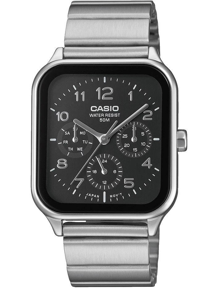 Размер корпуса 34×44.5×9.4 мм. обеспечивает комфортное ношение как на узком, так и на среднем запястье. Водозащита уровня WR50 позволяет не бояться дождя и брызг, что делает модель удобной в повседневных условиях. Практичность и простота обслуживания — ключевые преимущества линейки MTP.