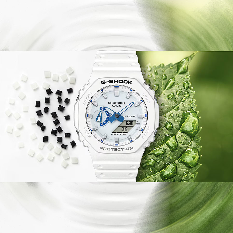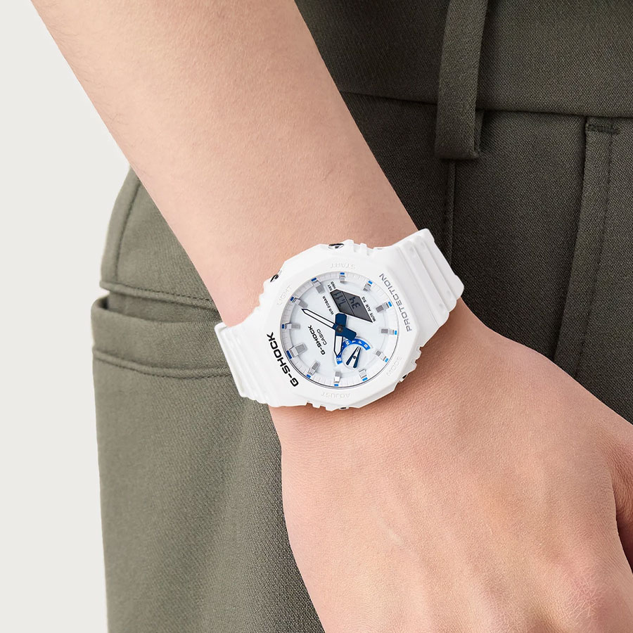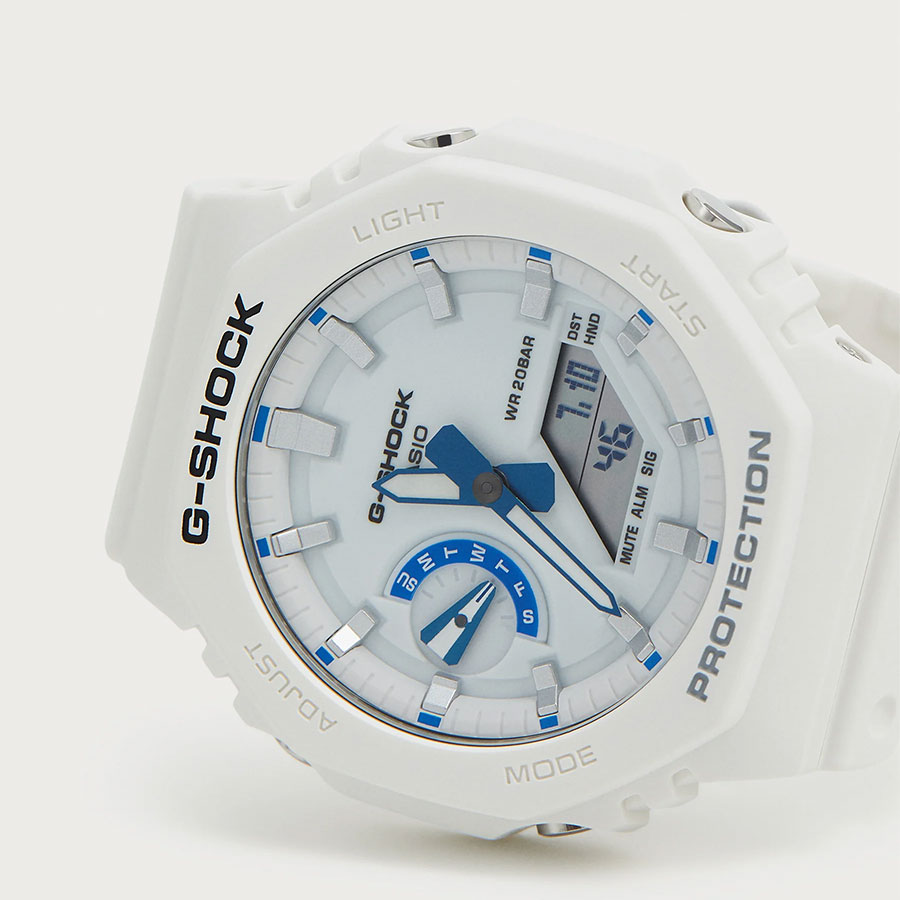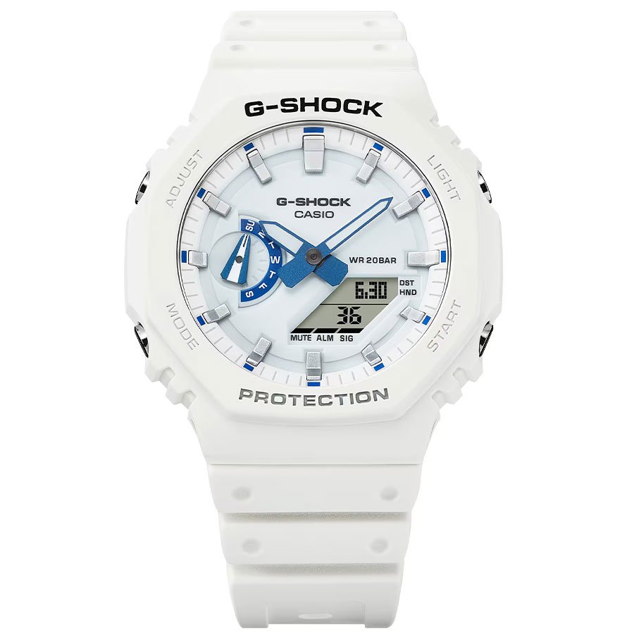 Противоударные кварцевые наручные часы Casio GA-2100HDS-7A коллекции G-Shock с цифровой+стрелочной индикацией времени. Тонкий корпус для данной коллекции — 11.8 мм. Калибр механизма — 5611. Корпус усилен углеродным волокном, изготовленным по технологии Carbon Core Guard. Функциональность данной модели: формат времени 12/24, автоматический календарь до 2099 года, функция летнего времени (DST), мировое время 48 городов (31 часовом поясе), двойное время, 5 независимых будильников, сигнал начала часа, секундомер с точностью 1/100 секунды и измерением до 23 часов 59 минут 59 cек., таймер обратного отсчета (диапазон времени 24 часа), двойная диодная подсветка циферблата с возможностью выбора времени свечения (1.5 или 3 секунды), функция выключения звука нажатия кнопок (Mute), функция смещения стрелок для удобного просмотра информации на цифровом экране. Стрелки покрыты необритовым (Neobrite) люминесцентным напылением (светятся в темноте). Циферблат выполнен из полимерных деталей, пропитанных фосфоресцирующим материалом, обеспечивающим зеленое свечение в темноте, которое подчеркивает характерный дизайн циферблата. Водонепроницаемость WR200 (20 атм). Размеры корпуса: (ШxВxТ) 45.4x48.5x11.8 мм. Гарантийный срок — 3 года (1 год от производителя + 2 года от магазина).