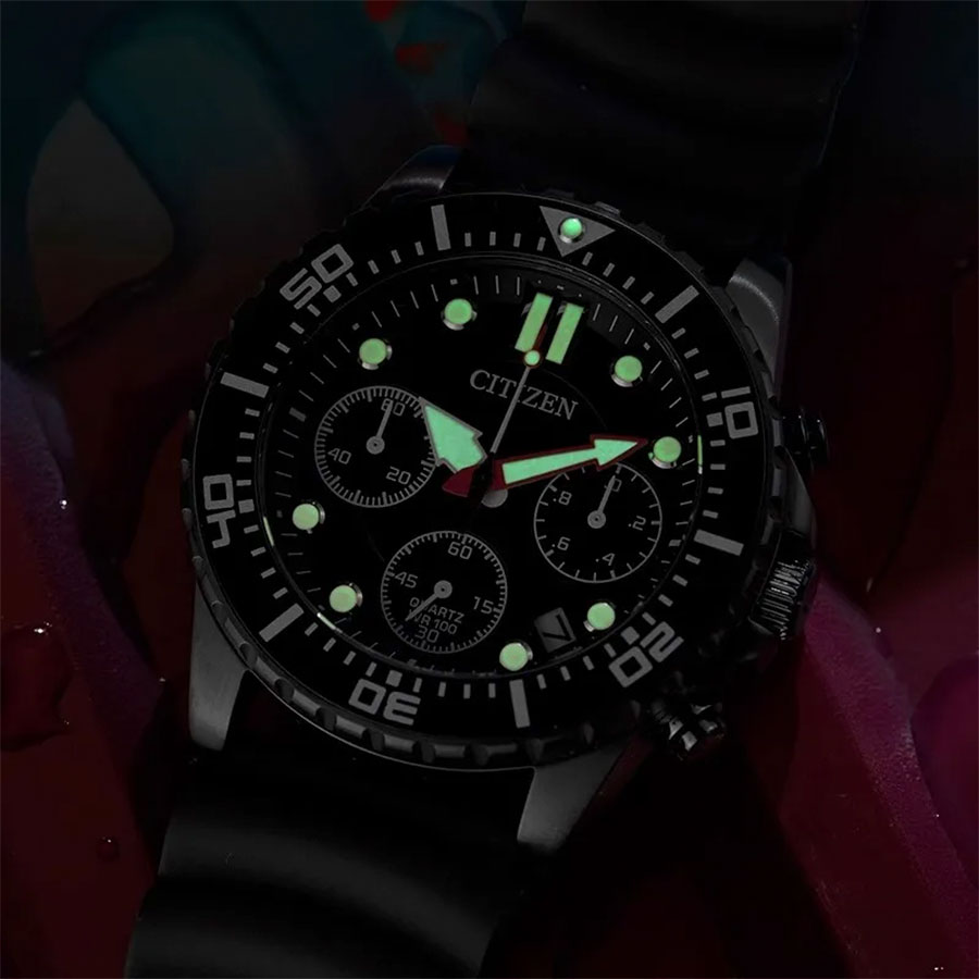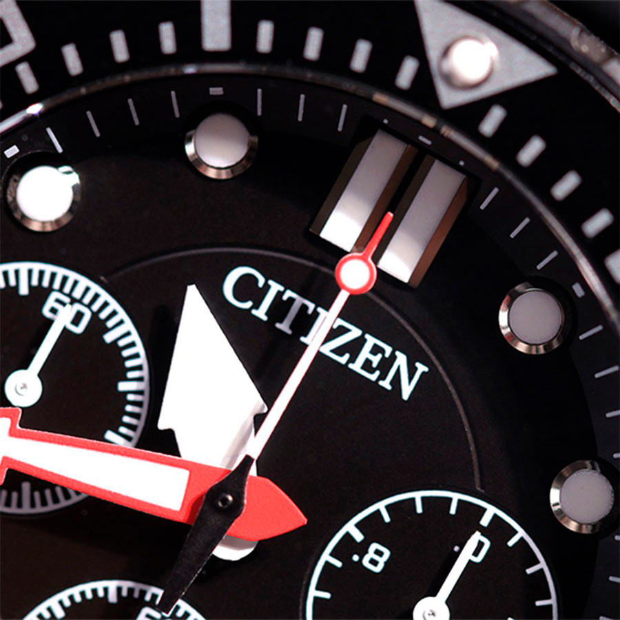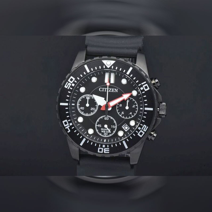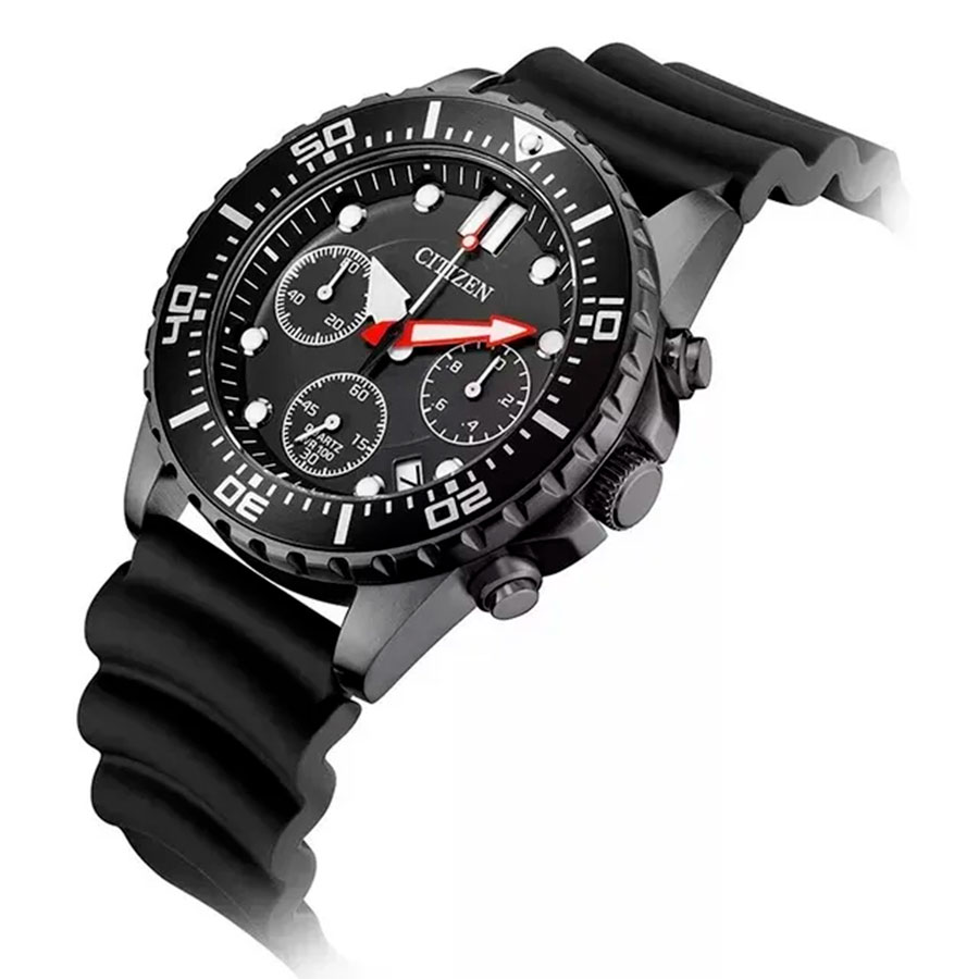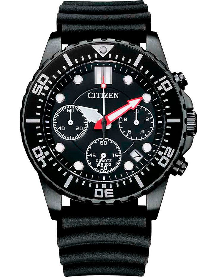 Мужские кварцевые наручные часы с хронографом (секундомером) Citizen AI5005-13E. Калибр механизма — 6520. На циферблате отображается текущая дата. Секундомер может отсчитывать до 11 часов 59 минут 59 сек. с точностью 1/20 сек. Стрелки и метки покрыты люминесцентным напылением (светятся в темноте). Вращающийся безель. Завинчивающаяся задняя крышка. На корпус нанесено стойкое PVD покрытие. Полимерный ремешок. Водонепроницаемость WR100 (10 атм).