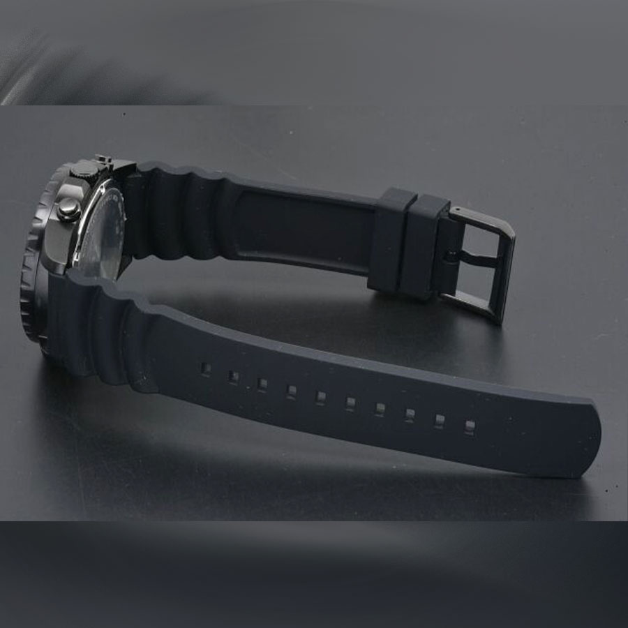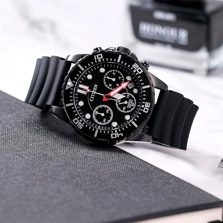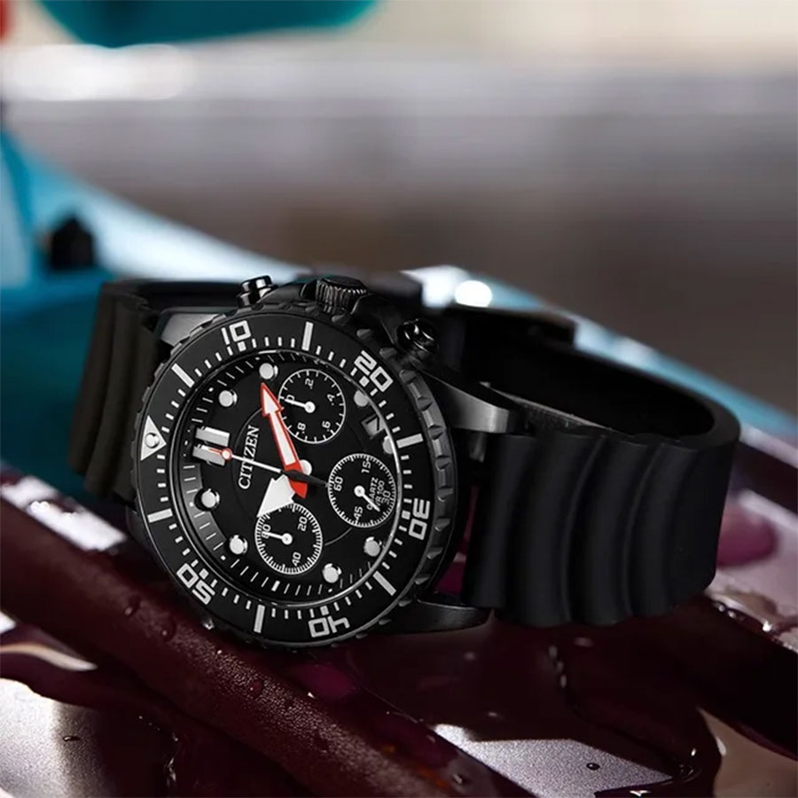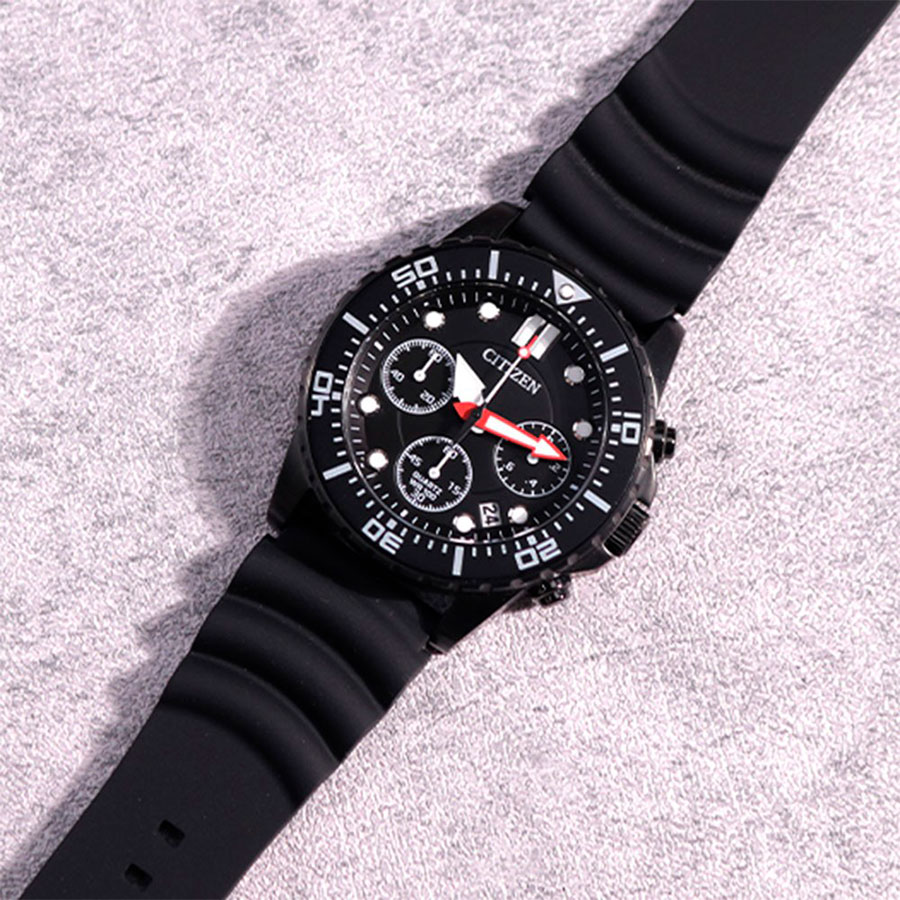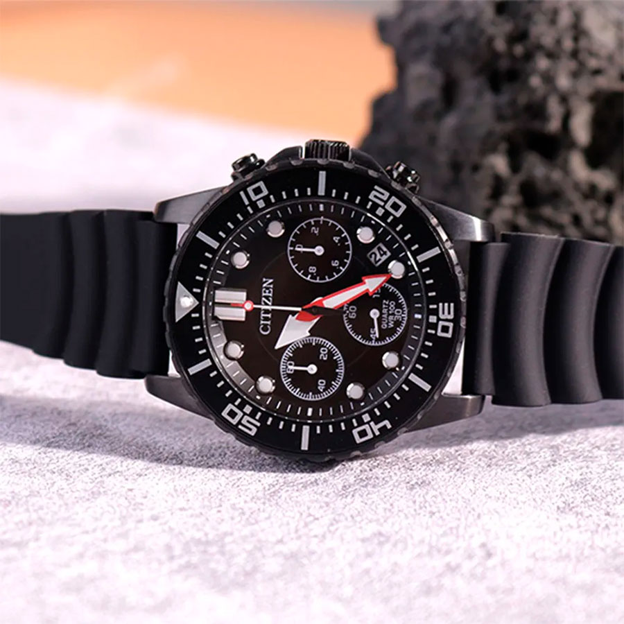 Мужские кварцевые наручные часы с хронографом (секундомером) Citizen AI5005-13E. Калибр механизма — 6520. На циферблате отображается текущая дата. Секундомер может отсчитывать до 11 часов 59 минут 59 сек. с точностью 1/20 сек. Стрелки и метки покрыты люминесцентным напылением (светятся в темноте). Вращающийся безель. Завинчивающаяся задняя крышка. На корпус нанесено стойкое PVD покрытие. Полимерный ремешок. Водонепроницаемость WR100 (10 атм).