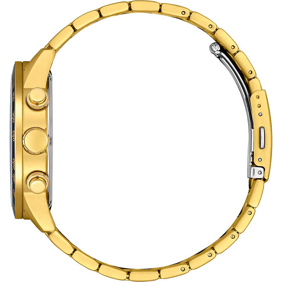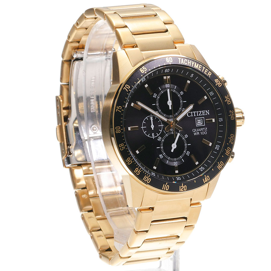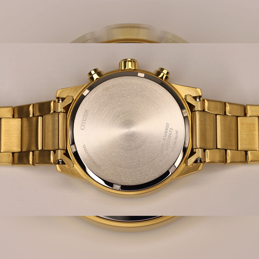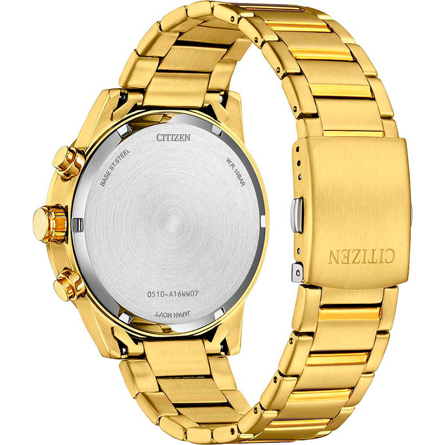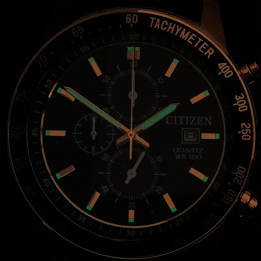Мужские кварцевые наручные часы с хронографом (секундомером) Citizen AN3682-54E. Калибр механизма — 0510. На циферблате отображается текущая дата. Секундомер может отсчитывать до 11 часов 59 минут 59 сек. Стрелки и метки покрыты люминесцентным напылением (светятся в темноте). На безеле присутствует шкала тахиметра для измерения средней скорости движения. Завинчивающаяся задняя крышка. На корпус и браслет нанесено стойкое PVD покрытие. Водонепроницаемость WR100 (10 атм).