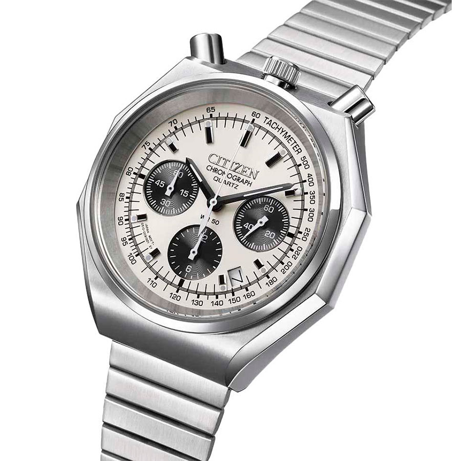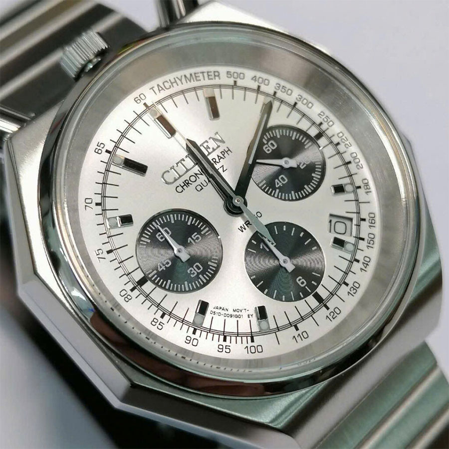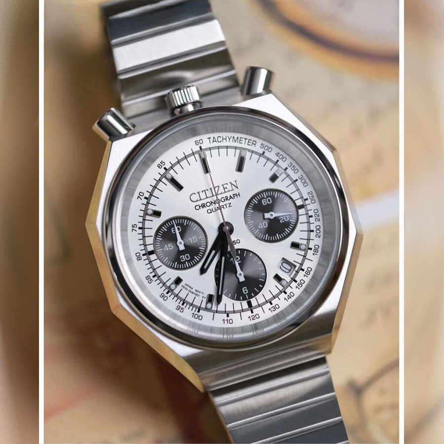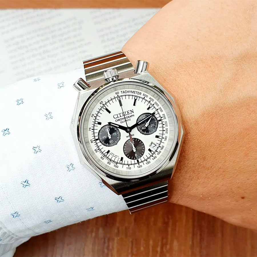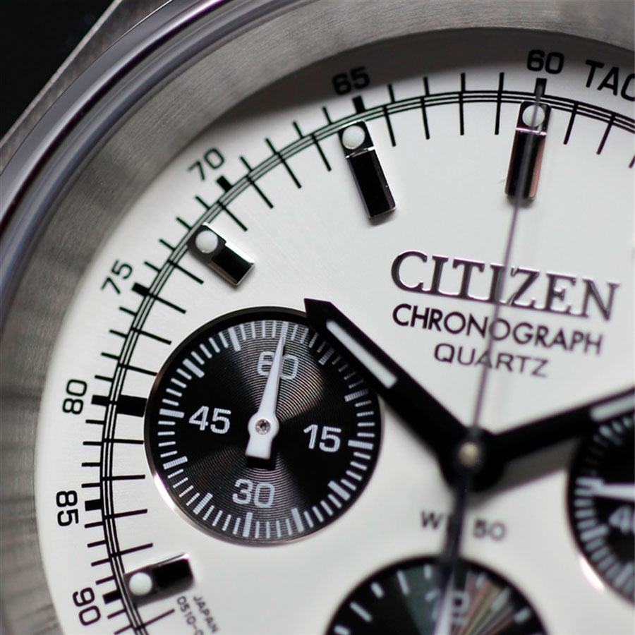 Мужские кварцевые наручные часы с хронографом (секундомером) Citizen AN3700-62A (верхнее расположение заводной головки и пушеров управления хронографом). Калибр механизма — 0510. На данной модели отображается дата. Секундомер может отсчитывать до 11 часов 59 минут 59 сек. На циферблате присутсвует шкала тахиметра для измерения средней скорости движения. Стрелки и метки покрыты люминесцентным напылением (светятся в темноте). Стальной браслет. Водонепроницаемость WR50 (5 атм).
