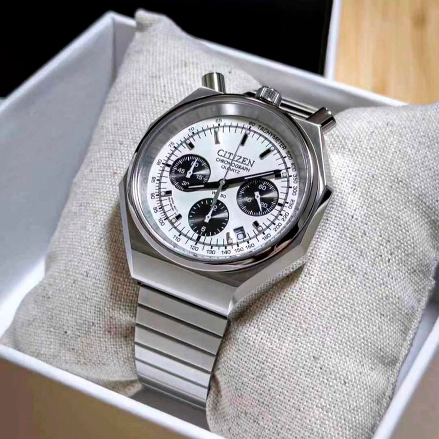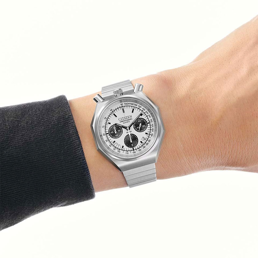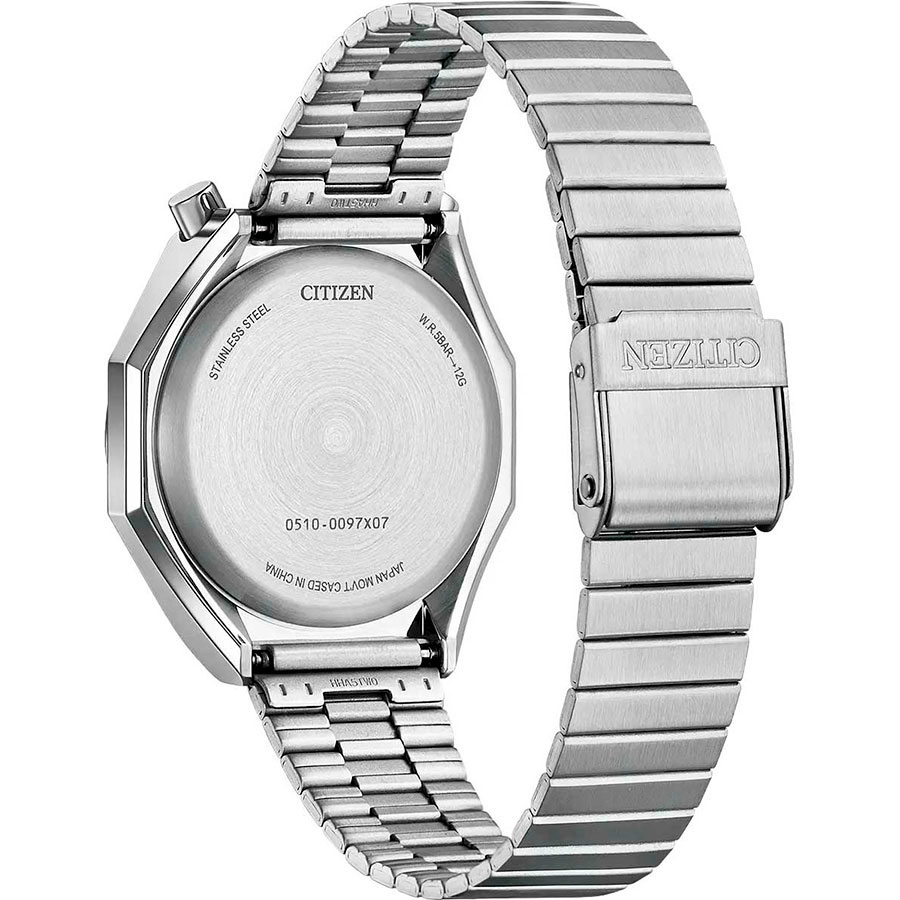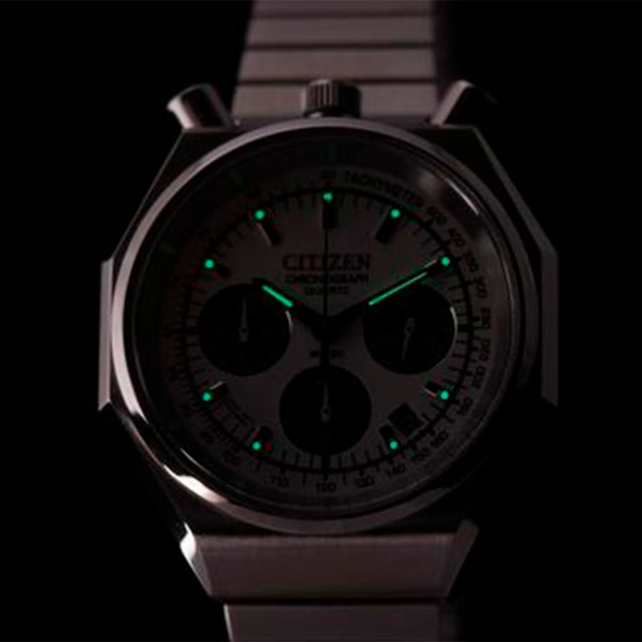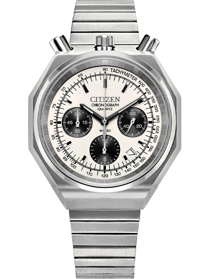 Мужские кварцевые наручные часы с хронографом (секундомером) Citizen AN3700-62A (верхнее расположение заводной головки и пушеров управления хронографом). Калибр механизма — 0510. На данной модели отображается дата. Секундомер может отсчитывать до 11 часов 59 минут 59 сек. На циферблате присутсвует шкала тахиметра для измерения средней скорости движения. Стрелки и метки покрыты люминесцентным напылением (светятся в темноте). Стальной браслет. Водонепроницаемость WR50 (5 атм).