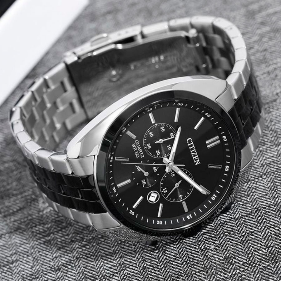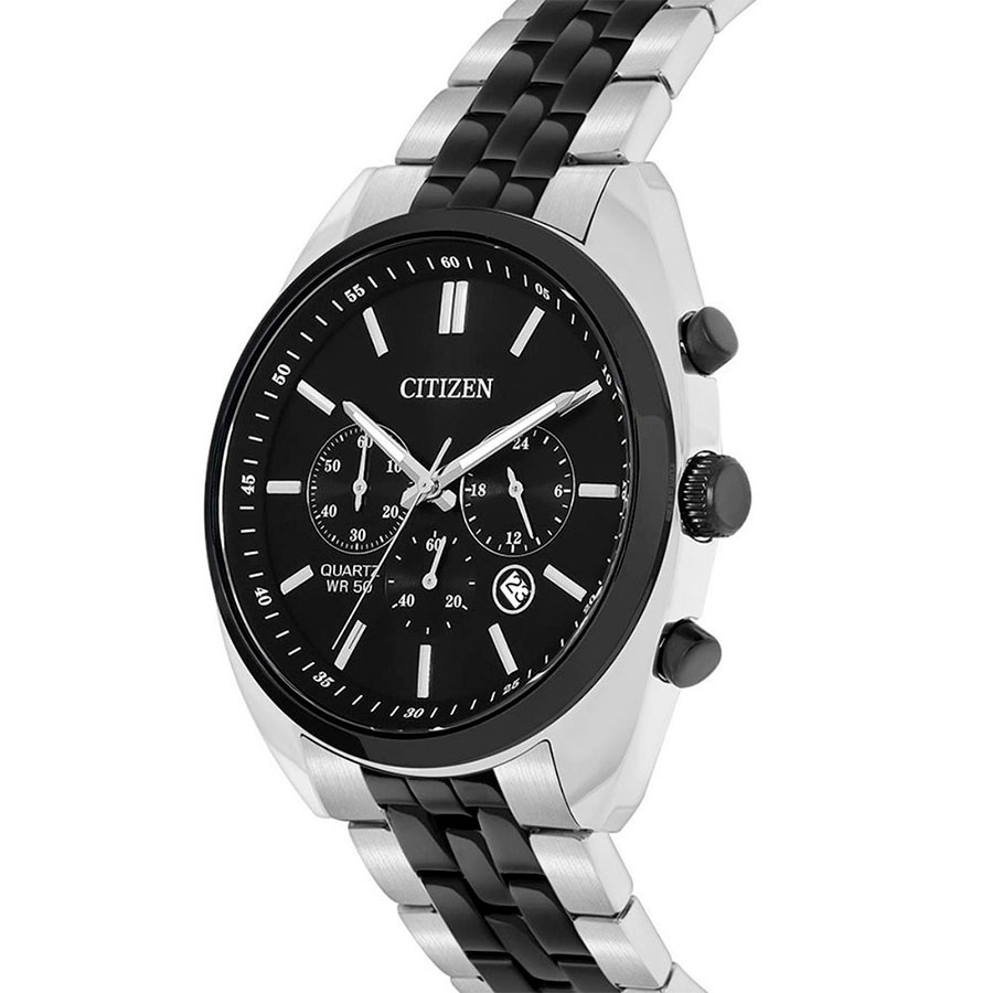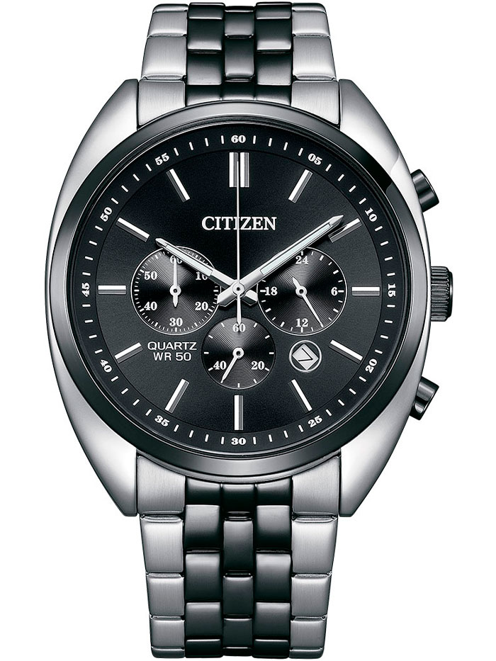 Мужские кварцевые наручные часы с хронографом (секундомером) Citizen AN8218-54E коллекции Basic. Калибр механизма — 0520. На данной модели отображается дата и время суток (24-х часовая шкала). Секундомер может отсчитывать до 59 минут 59 сек. На корпус и браслет частично нанесено стойкое PVD покрытие. Стрелки покрыты люминесцентным напылением (светятся в темноте). Водонепроницаемость WR50 (5 атм).