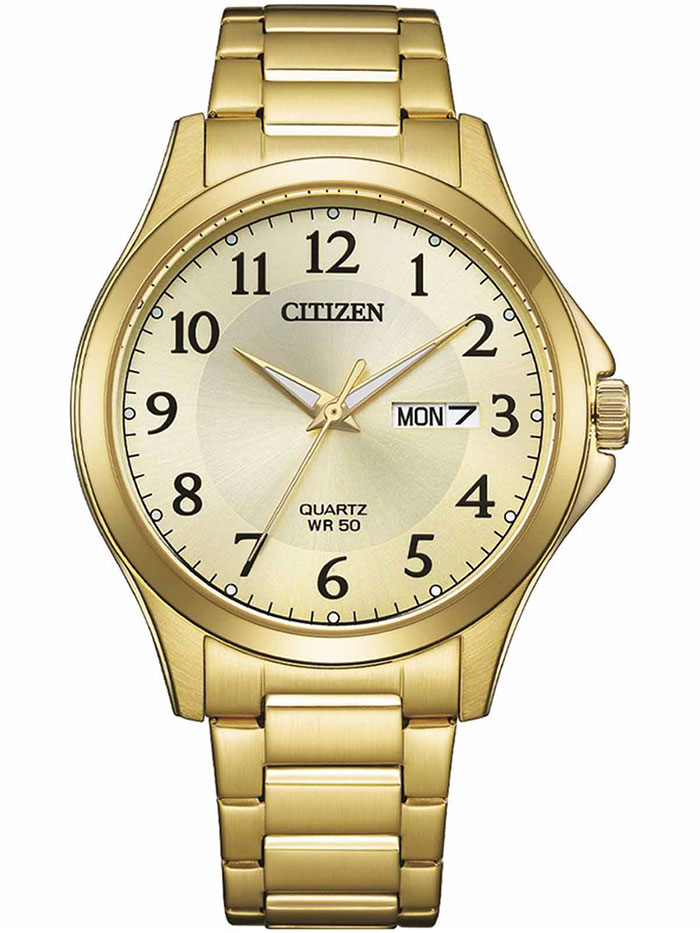 Мужские кварцевые наручные часы Citizen BF2028-83P коллекции Basic. Калибр механизма — 1502. На данной модели отображается день недели и текущая дата. Стрелки и метки покрыты люминесцентным напылением (светятся в темноте). Стальной браслет. На корпус и браслет нанесено стойкое PVD покрытие. Водонепроницаемость WR50 (5 атм).