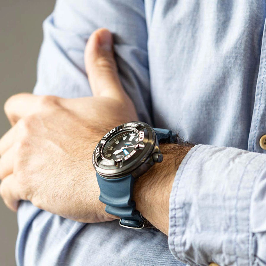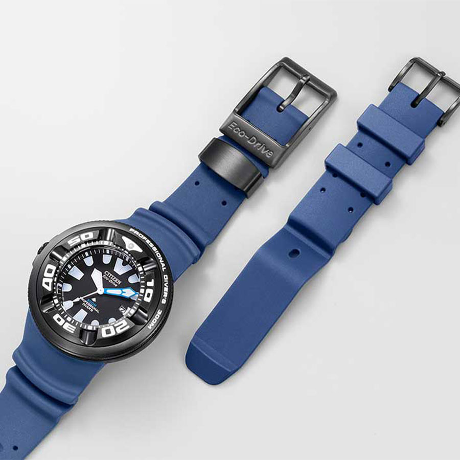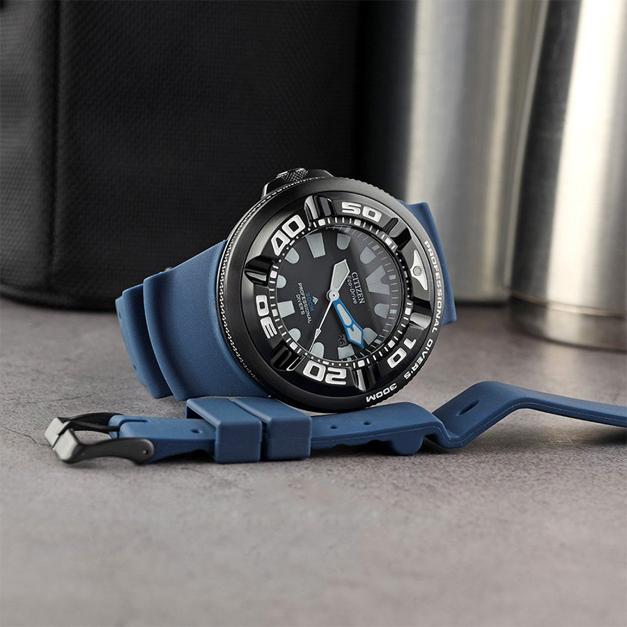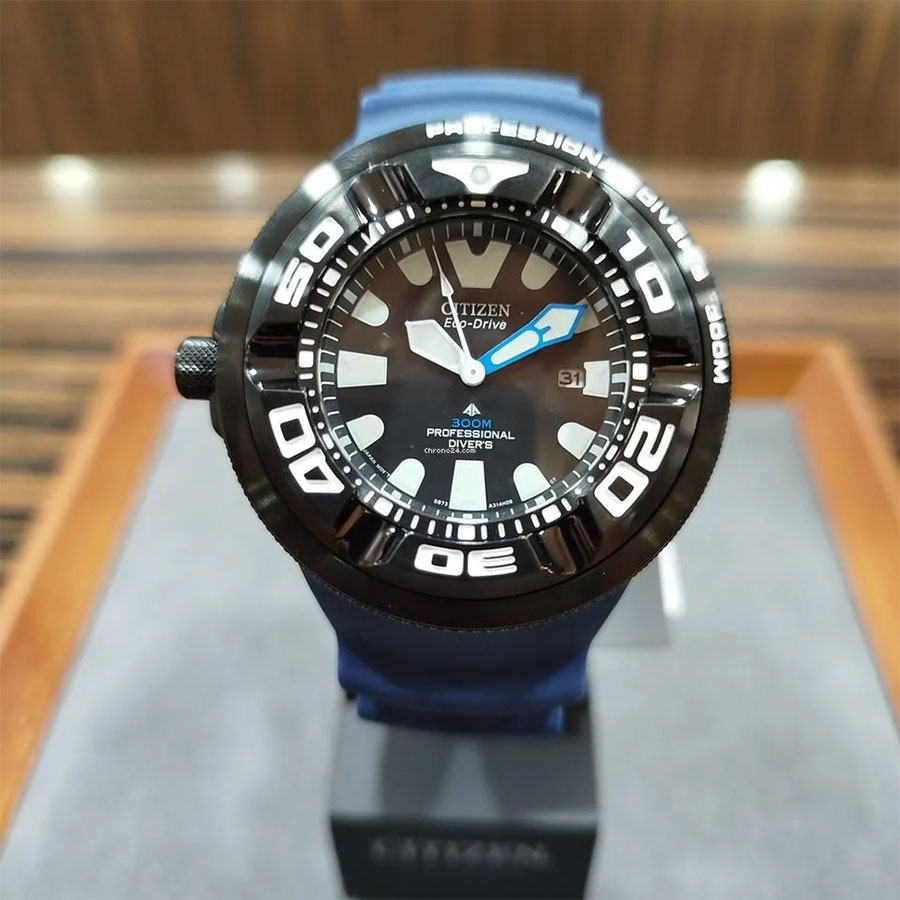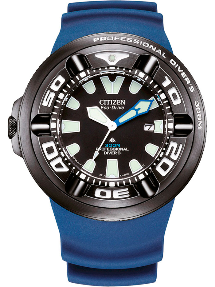 Мужские кварцевые наручные часы на солнечной батарее Citizen BJ8055-04E коллекции Eco-Drive Promaster Professional Diver. Калибр механизма — B873. Аккумулятор данной модели заряжается от любого источника света. Срок работы аккумулятора с полным зарядом — около 6-ти месяцев. Примерный срок службы аккумулятора — 10 лет. Присутствует функция информирования о недостаточном заряде и функция защиты от перезаряда. На данной модели отображается дата. Вращающийся в одном направлении безель. Данная модель является профессиональными дайверскими часами, обладает высокой степенью водонепроницаемости WR300 (30 атм), подходит для глубокого погружения под воду и соответствует стандарту дайверских часов ISO 6425. Завинчивающаяся задняя крышка и заводная головка. Стрелки и метки покрыты люминесцентным напылением (светятся в темноте). На корпус нанесено стойкое PVD покрытие. Полиуретановый ремешок.