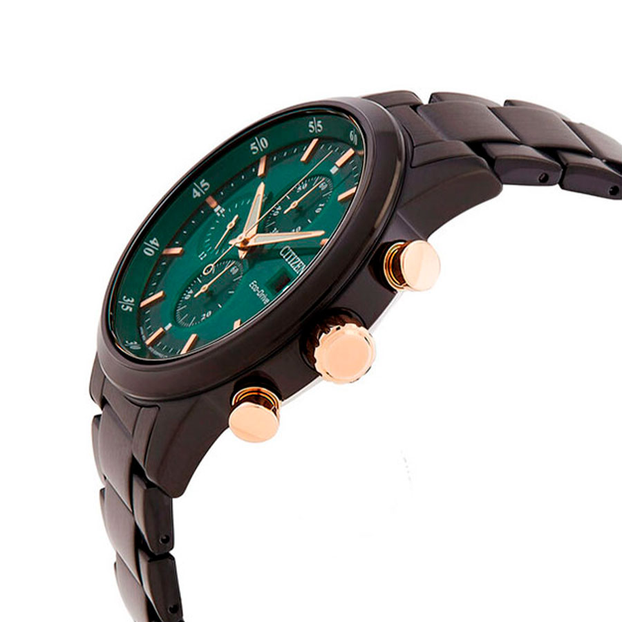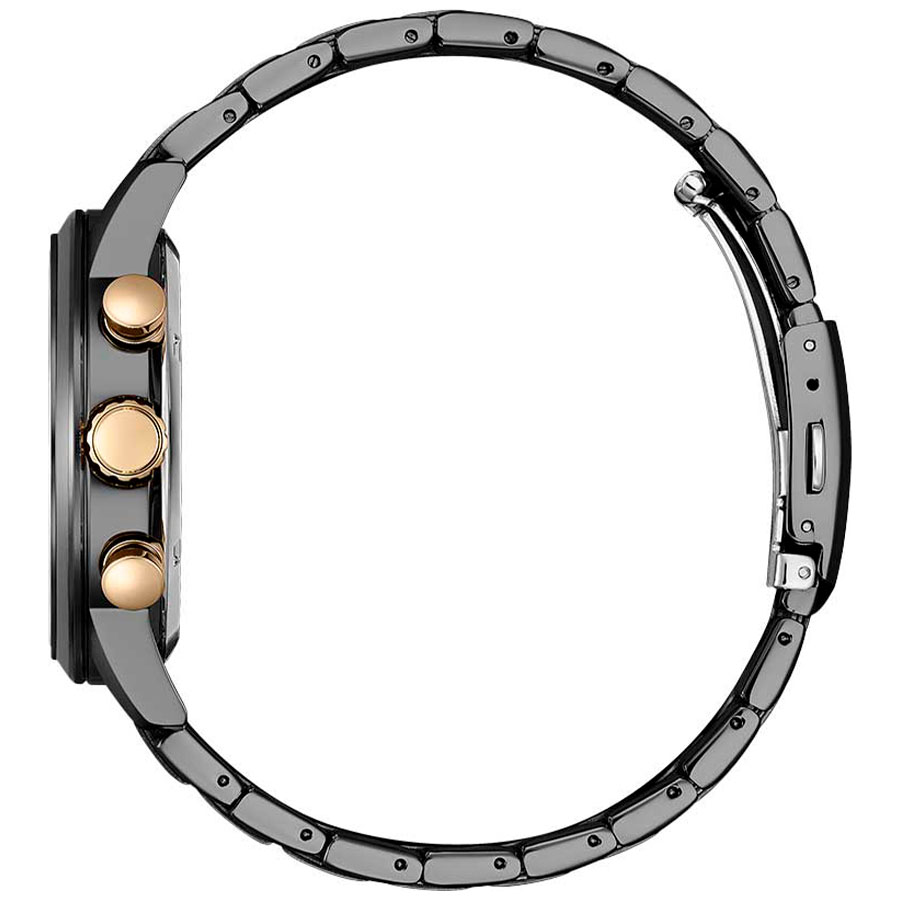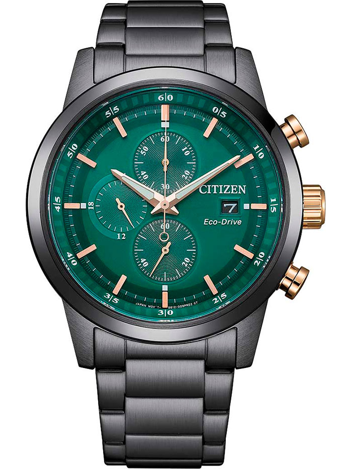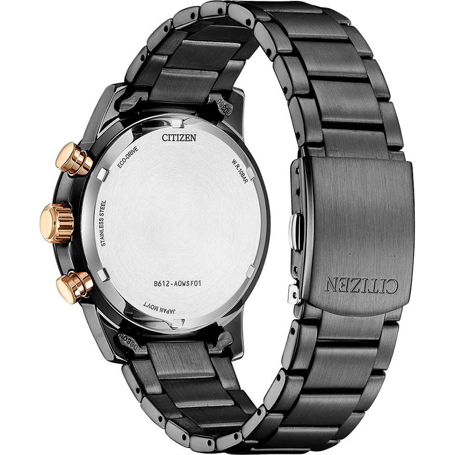 Мужские кварцевые часы с хронографом (секундомером) Citizen CA0746-85X коллекции Eco-Drive Chrono. Калибр механизма — B612. Аккумулятор данной модели заряжается от любого источника света. Срок работы аккумулятора с полным зарядом — 210 дней. Примерный срок службы аккумулятора — 10 лет. Присутствует функция информирования о недостаточном заряде и функция защиты от перезаряда. На данной модели отображается дата и время суток (24-х часовая шкала). Секундомер может отсчитывать до 59 минут 59 сек. с точностью 1/5 секунды. Стрелки и метки покрыты люминесцентным напылением (светятся в темноте). Завинчивающаяся задняя крышка. На корпус и браслет нанесено стойкое PVD покрытие. Водонепроницаемость WR100 (10 атм).