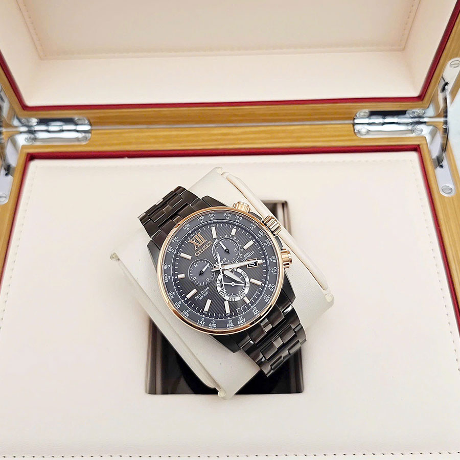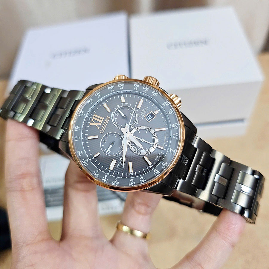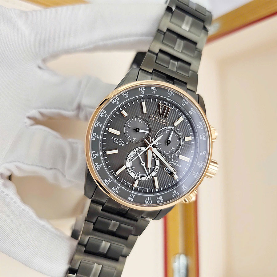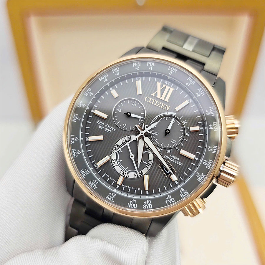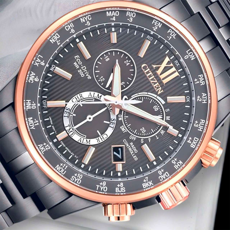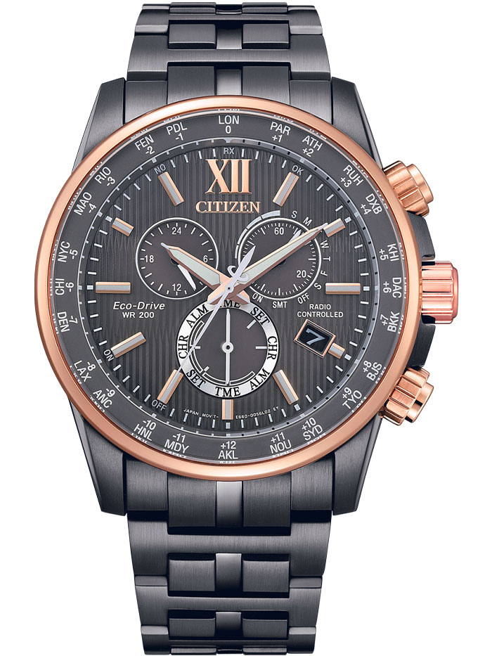 Мужские кварцевые наручные часы с вечным календарем и радиоконтролем на солнечной батарее Citizen CB5884-88H коллекции Radio Controled. Калибр механизма — E660. Особенность данной модели — в наличии функции автоматического календаря до 28 февраля 2100 года и функции контроля точного времени по радиосигналу. Так же присутствуют функции хронографа (секундомера), мирового времени (24 города) и будильника с возможностью установки на ближайшие 12 часов. Аккумулятор данной модели заряжается от любого источника света. Срок работы аккумулятора с полным зарядом — 180 дней. Примерный срок службы аккумулятора — 10 лет. Присутствует индикатор уровня заряда аккумулятора. На данной модели отображается текущая дата, день недели и время суток в 24-х часовом формате. Стрелки и метки покрыты люминесцентным напылением (светятся в темноте). Установлено устойчивое к появлению царапин сапфировое стекло с антибликовым покрытием. На корпус и браслет нанесено стойкое PVD покрытие. Данная модель обладает высокой степенью водонепроницаемости WR200 (20 атм) и подходит для глубокого погружения под воду.