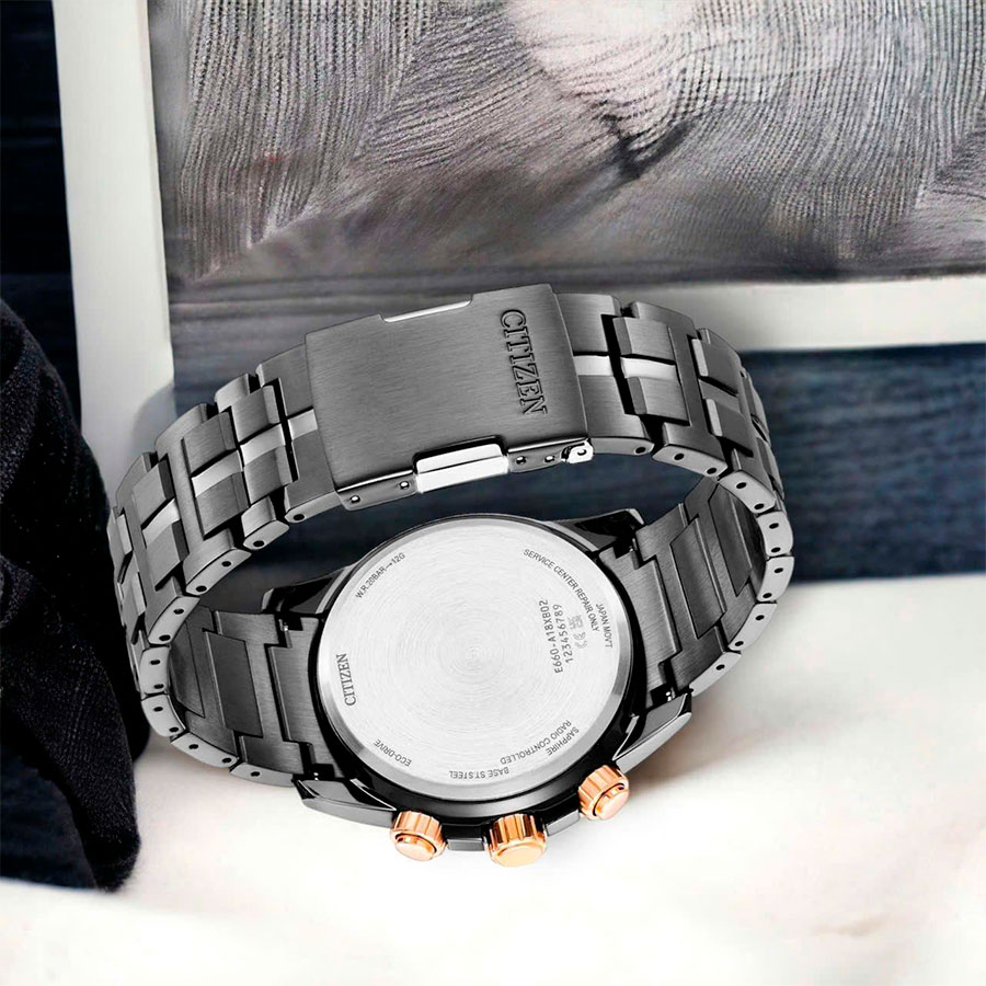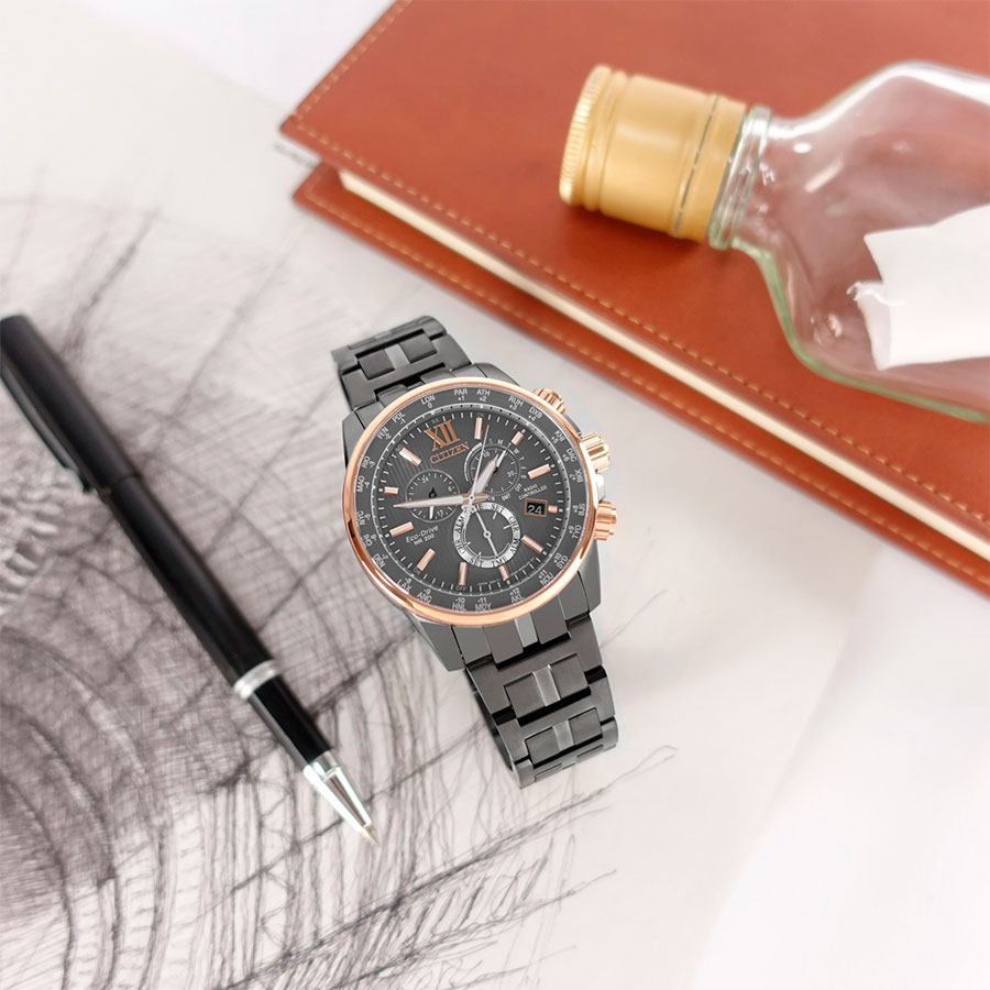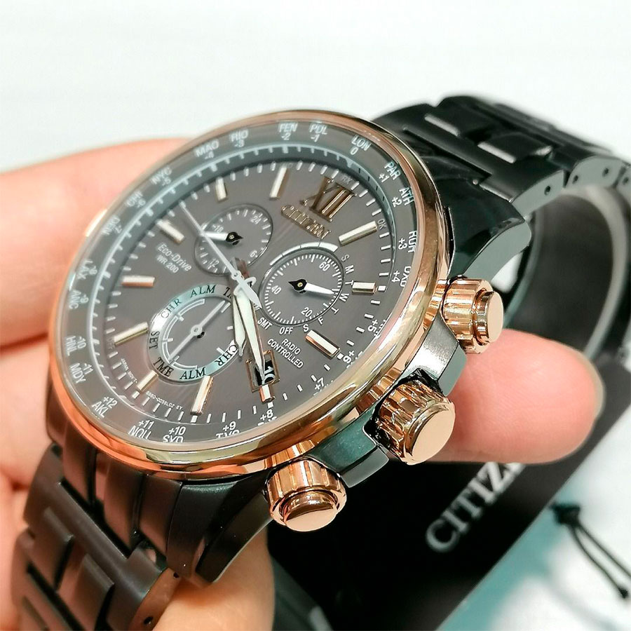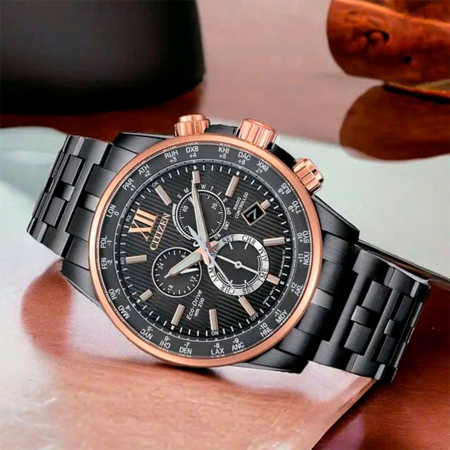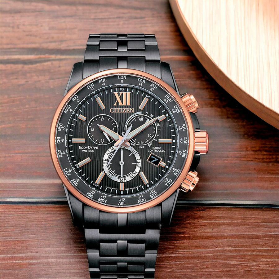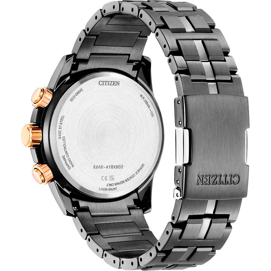 Мужские кварцевые наручные часы с вечным календарем и радиоконтролем на солнечной батарее Citizen CB5884-88H коллекции Radio Controled. Калибр механизма — E660. Особенность данной модели — в наличии функции автоматического календаря до 28 февраля 2100 года и функции контроля точного времени по радиосигналу. Так же присутствуют функции хронографа (секундомера), мирового времени (24 города) и будильника с возможностью установки на ближайшие 12 часов. Аккумулятор данной модели заряжается от любого источника света. Срок работы аккумулятора с полным зарядом — 180 дней. Примерный срок службы аккумулятора — 10 лет. Присутствует индикатор уровня заряда аккумулятора. На данной модели отображается текущая дата, день недели и время суток в 24-х часовом формате. Стрелки и метки покрыты люминесцентным напылением (светятся в темноте). Установлено устойчивое к появлению царапин сапфировое стекло с антибликовым покрытием. На корпус и браслет нанесено стойкое PVD покрытие. Данная модель обладает высокой степенью водонепроницаемости WR200 (20 атм) и подходит для глубокого погружения под воду.