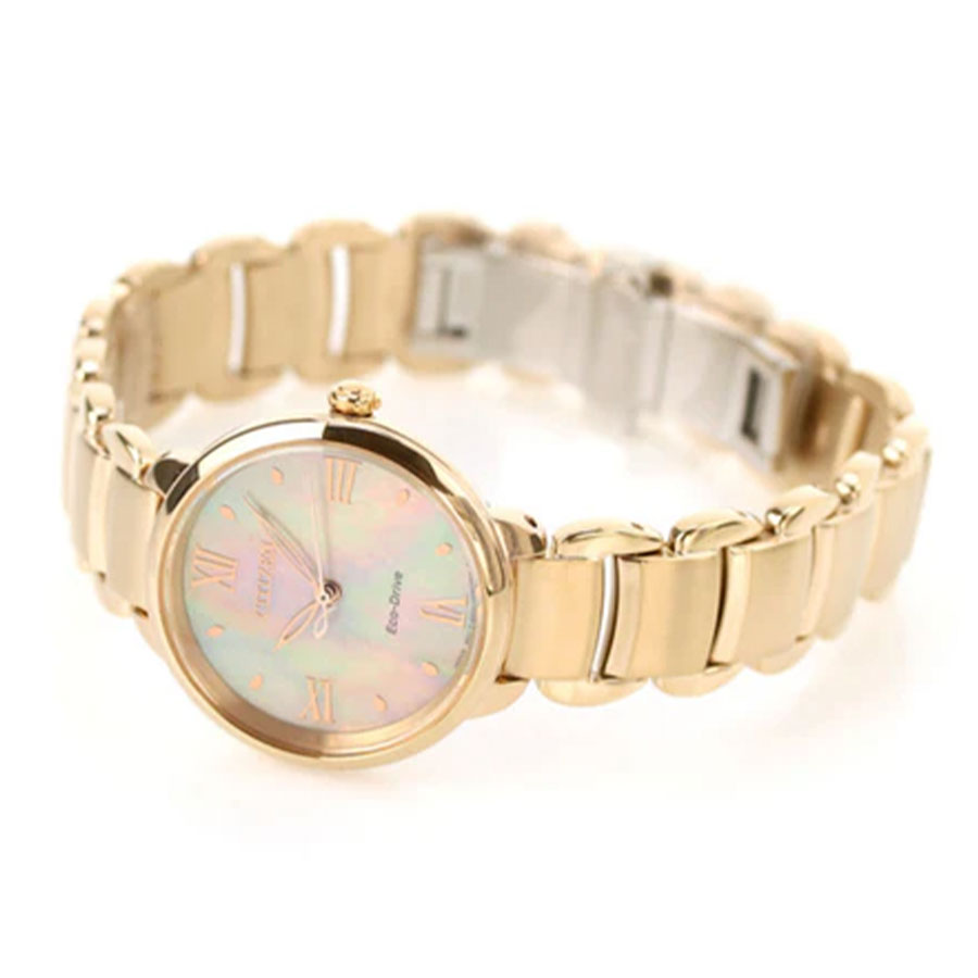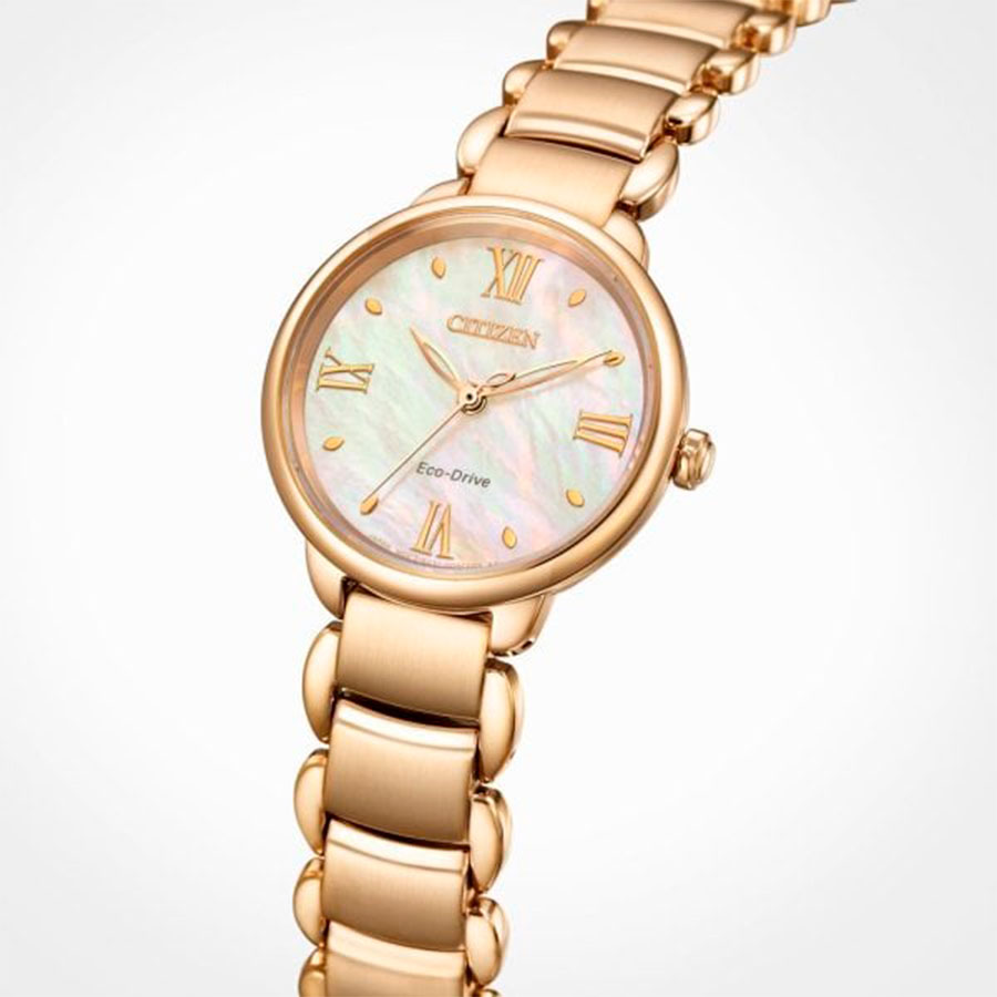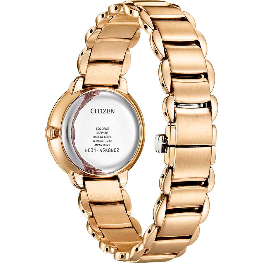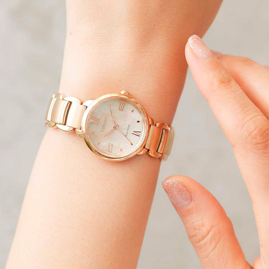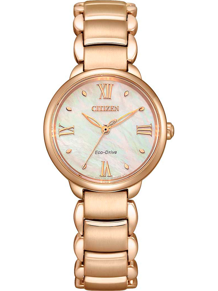 Женские кварцевые часы на солнечной батарее Citizen EM0929-81Y коллекции Eco-Drive. Калибр механизма — E031. Аккумулятор данной модели заряжается от любого источника света. Срок работы аккумулятора с полным зарядом — до 180 дней. Примерный срок службы аккумулятора — 10 лет. Имеется функция предупреждения о недостаточном заряде и функция предотвращения перезаряда. Установлено устойчивое к царапинам сапфировое стекло. Стальной браслет. На корпус и браслет нанесено стойкое PVD покрытие. Водонепроницаемость WR50 (5 атм).