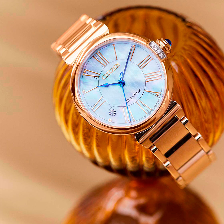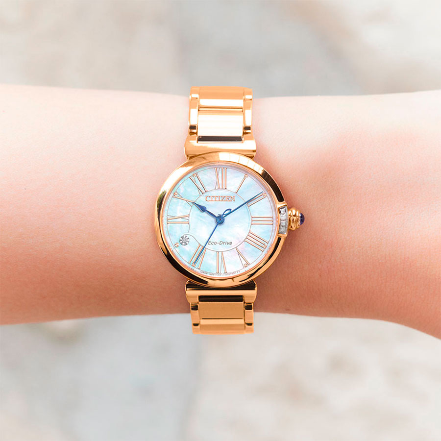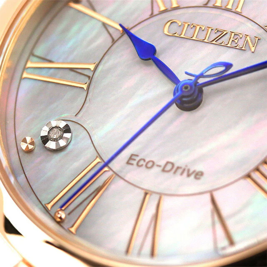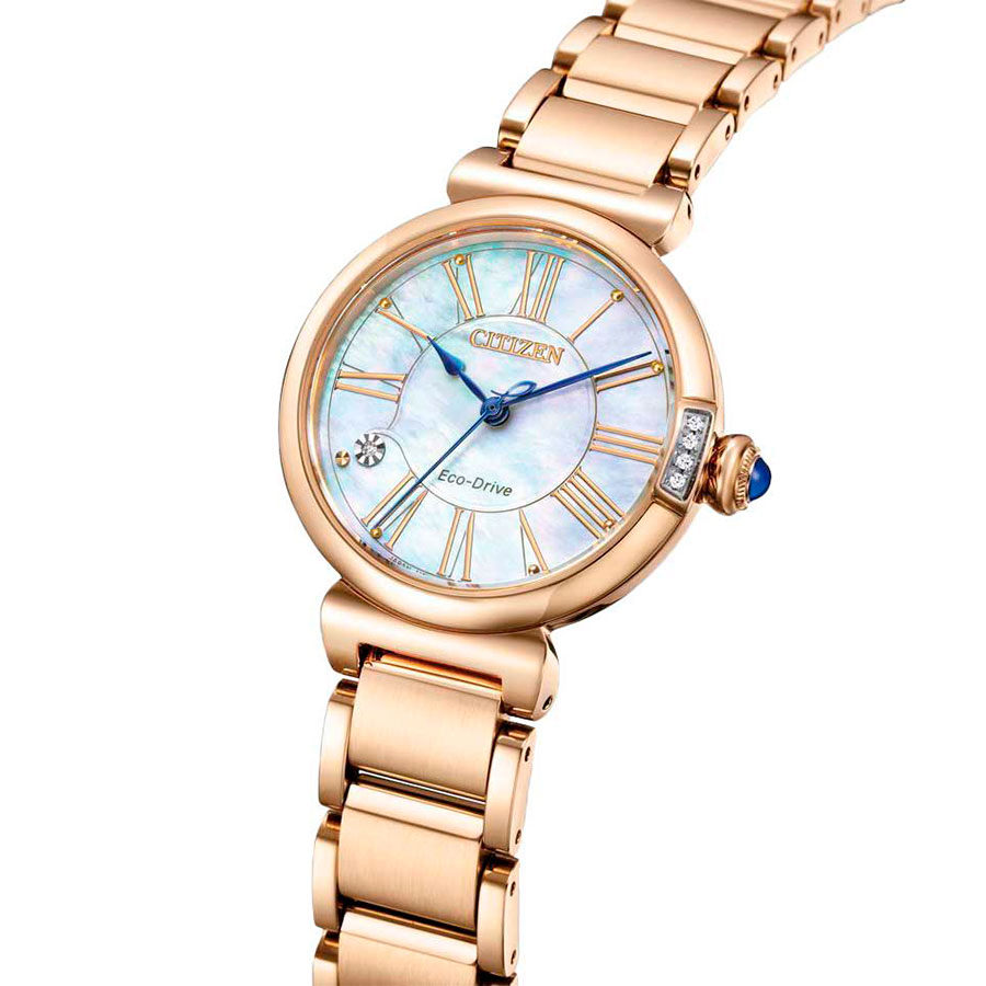 Женские кварцевые часы на солнечной батарее Citizen EM1063-89D коллекции Eco-Drive. Калибр механизма — E031. Аккумулятор данной модели заряжается от любого источника света. Срок работы аккумулятора с полным зарядом — до 180 дней. Примерный срок службы аккумулятора — 10 лет. Имеется функция предупреждения о недостаточном заряде и функция предотвращения перезаряда. Установлено устойчивое к царапинам сапфировое стекло. Стальной браслет. На корпус и браслет нанесено стойкое PVD покрытие. Корпус и циферблат украшены кристаллами. Заводная головка украшена камнем в форме кабошона. Водонепроницаемость WR50 (5 атм).