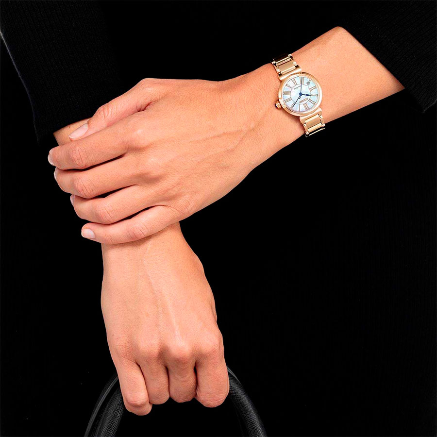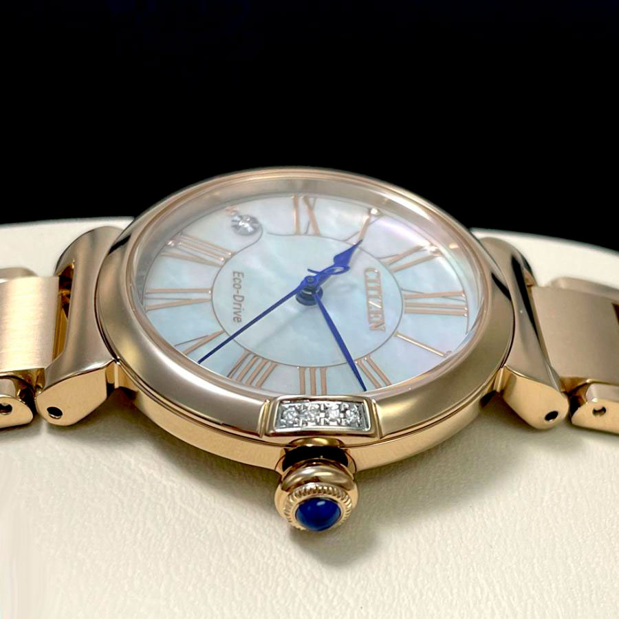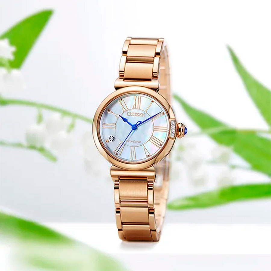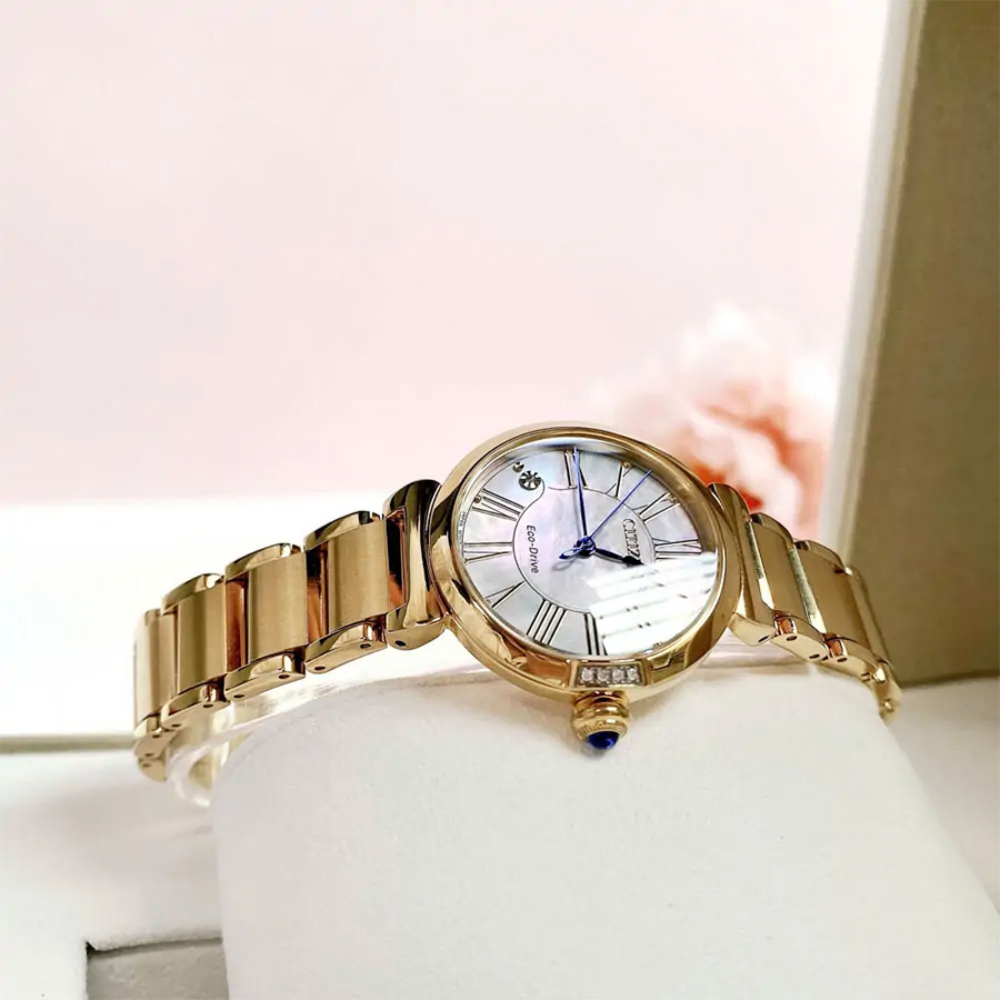 Женские кварцевые часы на солнечной батарее Citizen EM1063-89D коллекции Eco-Drive. Калибр механизма — E031. Аккумулятор данной модели заряжается от любого источника света. Срок работы аккумулятора с полным зарядом — до 180 дней. Примерный срок службы аккумулятора — 10 лет. Имеется функция предупреждения о недостаточном заряде и функция предотвращения перезаряда. Установлено устойчивое к царапинам сапфировое стекло. Стальной браслет. На корпус и браслет нанесено стойкое PVD покрытие. Корпус и циферблат украшены кристаллами. Заводная головка украшена камнем в форме кабошона. Водонепроницаемость WR50 (5 атм).