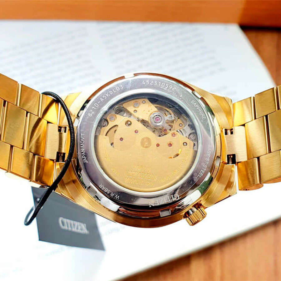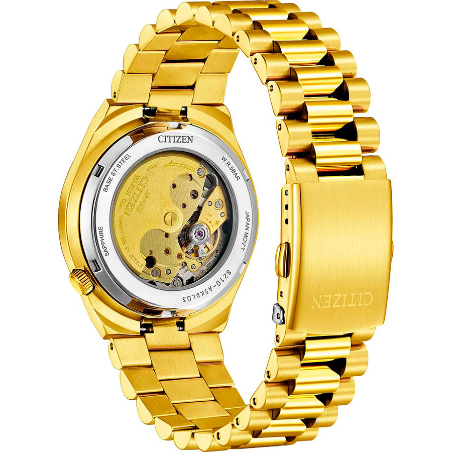 Мужские механические наручные часы с автоподзаводом и возможностью ручного завода Citizen NJ0152-51X коллекции Automatic. Калибр механизма — 8210. Запас хода не менее 40-ка часов. Количество камней - 21. На данной модели отображается текущая дата. Установлено сапфировое стекло с увеличительным сегментом устойчивое к царапинам. Прозрачная завинчивающаяся задняя крышка. Стальной браслет. На корпус и браслет нанесено стойкое PVD покрытие. Стрелки и метки покрыты люминесцентным напылением (светятся в темноте). Водонепроницаемость WR50 (5 атм).