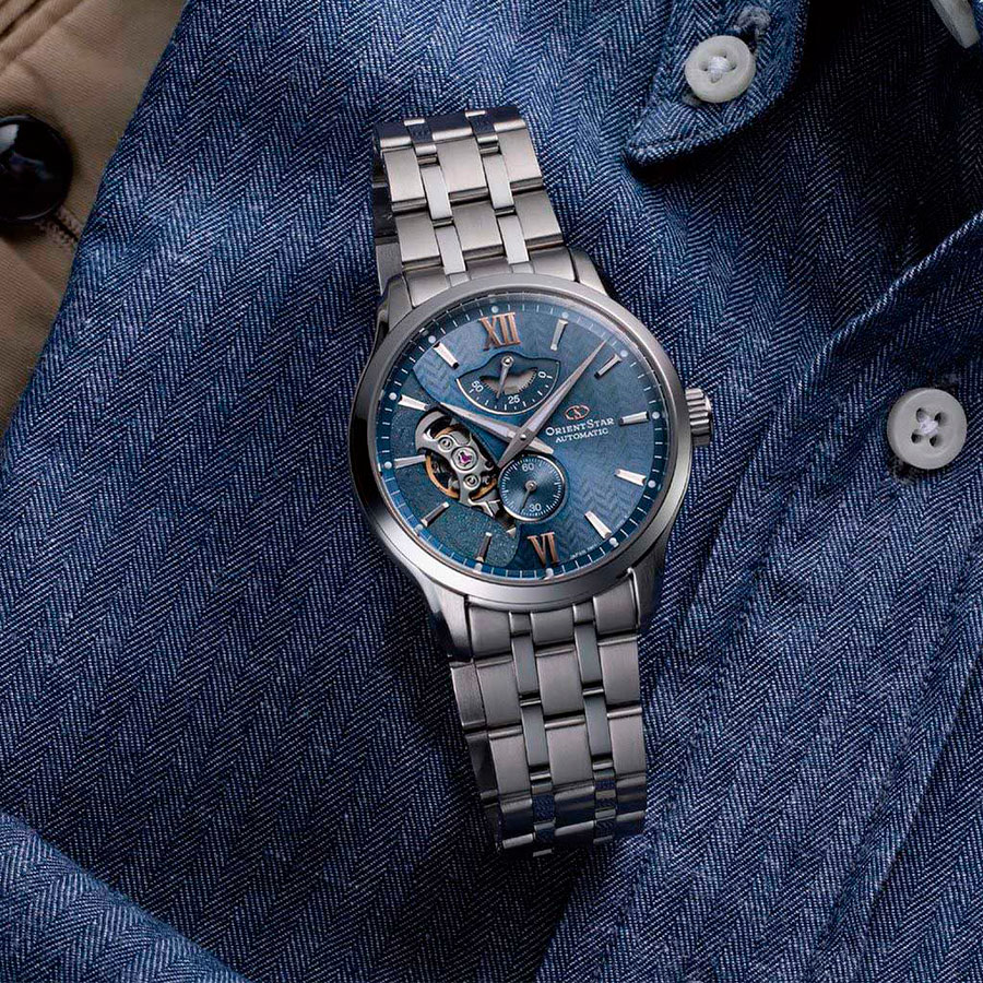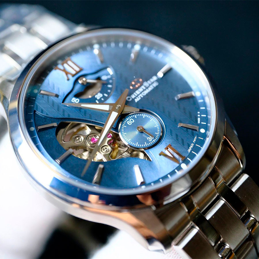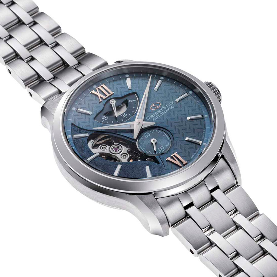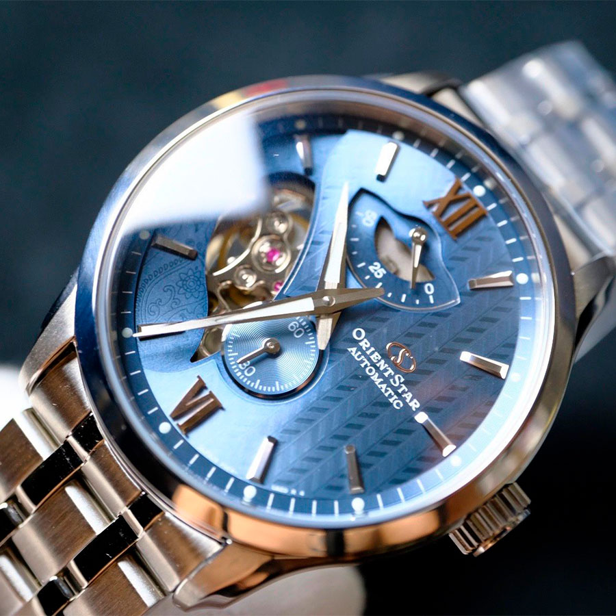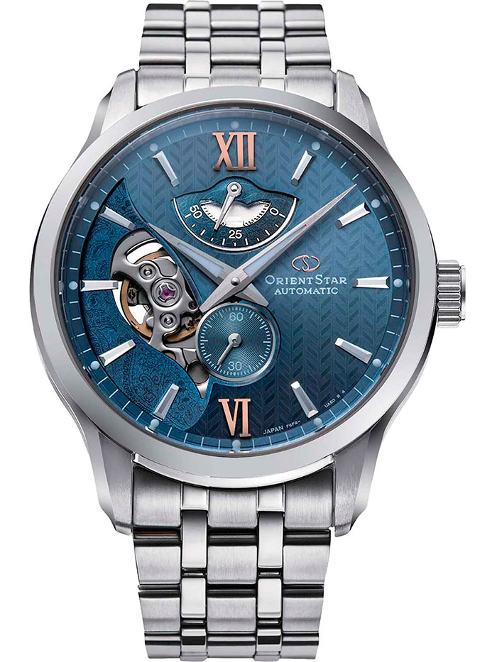 Мужские механические наручные часы с автоподзаводом и возможностью ручного завода Orient Star RK-AV0B08L коллекции Contemporary. Многослойный каркас украшен двухслойным циферблатом с мотивами из костюмной ткани. Циферблат верхнего слоя, представляющий внешний материал костюма, выполнен с рисунком в елочку, в то время как циферблат нижнего слоя украшен узором в виде пейсли с отливом, напоминающим подкладку из меди. Контрастные ткани придают уникальный акцент общему виду часов. Полукостюмное отверстие на циферблате выполнено в форме пейсли, а ажурный дизайн индикатора запаса хода также раскрывает внутреннюю работу механического механизма. Ощущение глубины в сочетании с текстильными узорами создает привлекательный образ. А мягкие изгибы ушек напоминают ямочку от галстука или драпировку ткани. Слегка отличающиеся дымчато-голубые тона новых моделей подчеркивают каждый слой и придают красочный акцент металлическому ощущению циферблата. Это идеальные часы для современного делового человека, который придерживается повседневного стиля и хочет выразить свою индивидуальность. Калибр механизма — F6F44. Запас хода не менее 50-ти часов. 21 600 полуколебаний в час. Количество камней - 24. На циферблате установлен ретроградный индикатор запаса хода, а так же на циферблате расположено прозрачное окошко, через которое частично видно работу механизма. Стрелки и метки покрыты люминесцентным напылением (светятся в темноте). Функция стоп-секунда (остановка секундной стрелки для установки точного времени). Элементы корпуса отполированы вручную по технологии Zaratsu. Прозрачная завинчивающаяся задняя крышка. Установлено устойчивое к царапинам сапфировое стекло с антибликовым покрытием. Водонепроницаемость WR100 (10 атм). Японская сборка (Made In Japan).