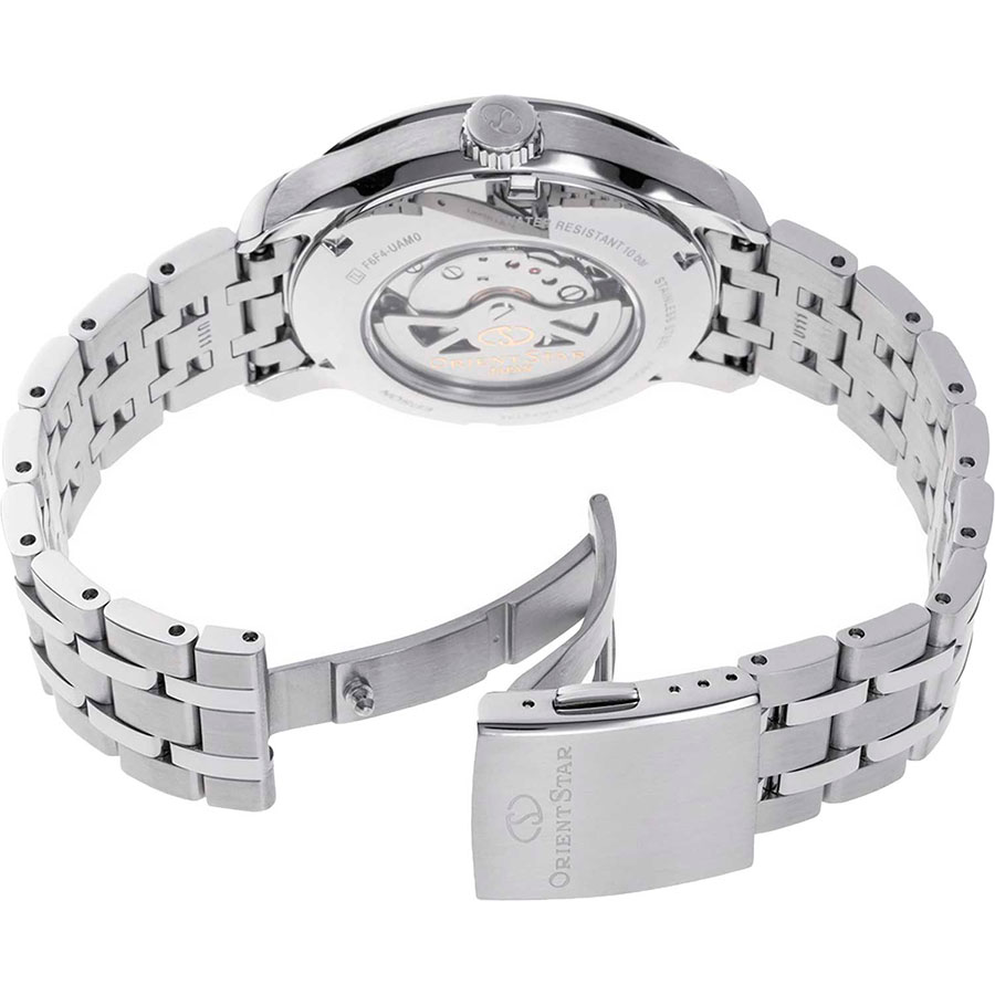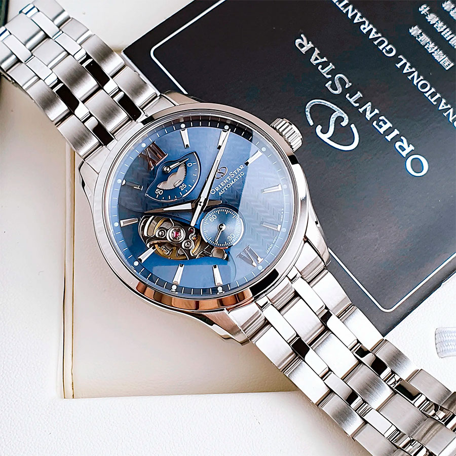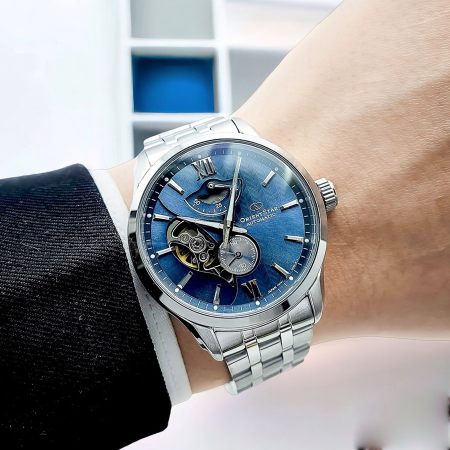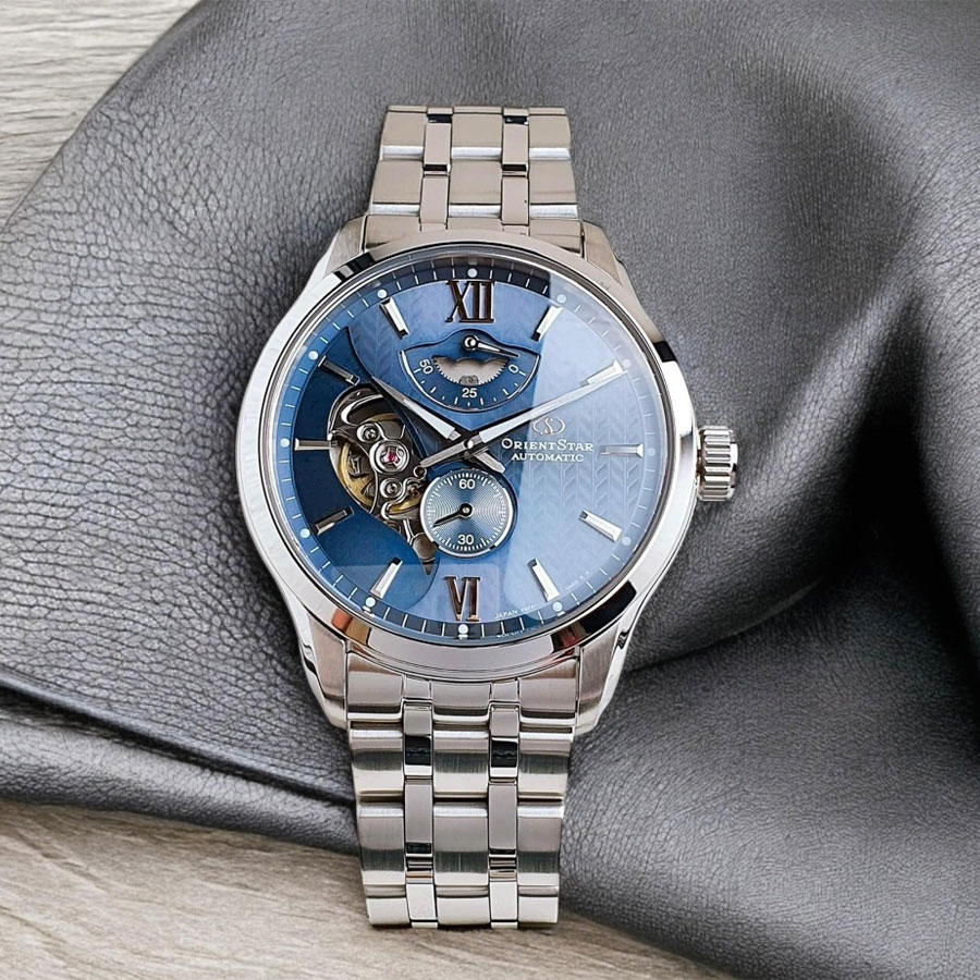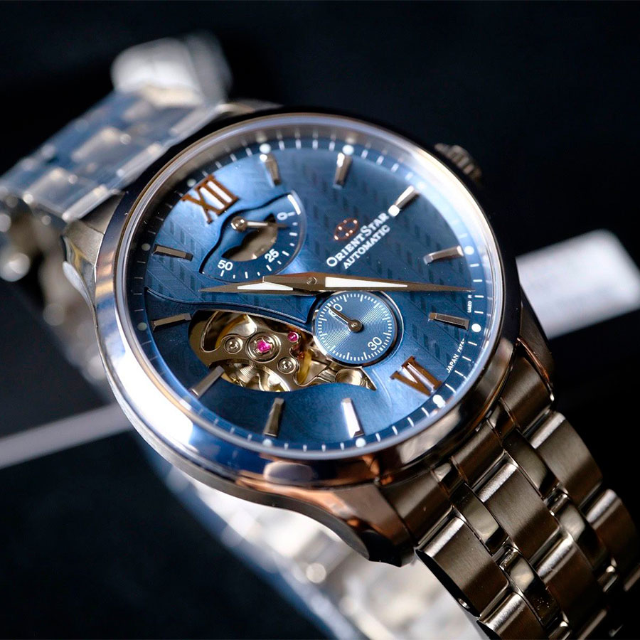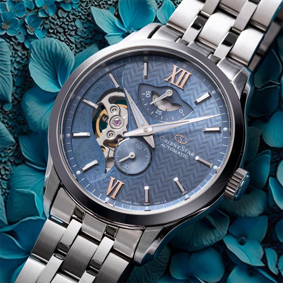 Мужские механические наручные часы с автоподзаводом и возможностью ручного завода Orient Star RK-AV0B08L коллекции Contemporary. Многослойный каркас украшен двухслойным циферблатом с мотивами из костюмной ткани. Циферблат верхнего слоя, представляющий внешний материал костюма, выполнен с рисунком в елочку, в то время как циферблат нижнего слоя украшен узором в виде пейсли с отливом, напоминающим подкладку из меди. Контрастные ткани придают уникальный акцент общему виду часов. Полукостюмное отверстие на циферблате выполнено в форме пейсли, а ажурный дизайн индикатора запаса хода также раскрывает внутреннюю работу механического механизма. Ощущение глубины в сочетании с текстильными узорами создает привлекательный образ. А мягкие изгибы ушек напоминают ямочку от галстука или драпировку ткани. Слегка отличающиеся дымчато-голубые тона новых моделей подчеркивают каждый слой и придают красочный акцент металлическому ощущению циферблата. Это идеальные часы для современного делового человека, который придерживается повседневного стиля и хочет выразить свою индивидуальность. Калибр механизма — F6F44. Запас хода не менее 50-ти часов. 21 600 полуколебаний в час. Количество камней - 24. На циферблате установлен ретроградный индикатор запаса хода, а так же на циферблате расположено прозрачное окошко, через которое частично видно работу механизма. Стрелки и метки покрыты люминесцентным напылением (светятся в темноте). Функция стоп-секунда (остановка секундной стрелки для установки точного времени). Элементы корпуса отполированы вручную по технологии Zaratsu. Прозрачная завинчивающаяся задняя крышка. Установлено устойчивое к царапинам сапфировое стекло с антибликовым покрытием. Водонепроницаемость WR100 (10 атм). Японская сборка (Made In Japan).
