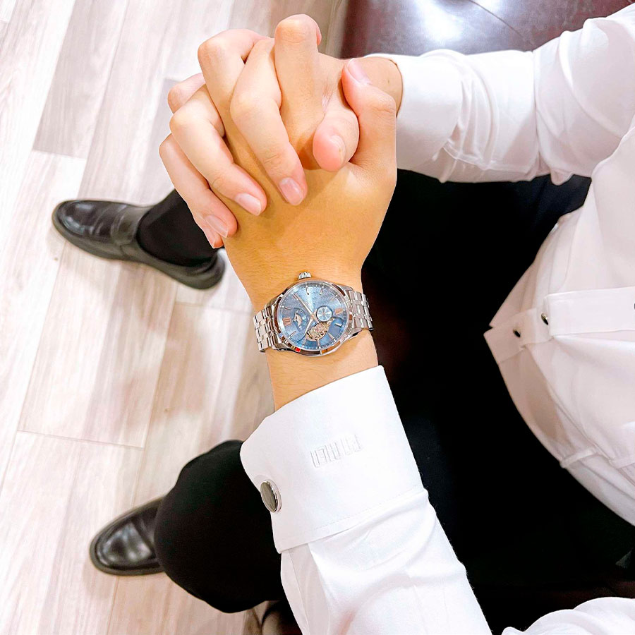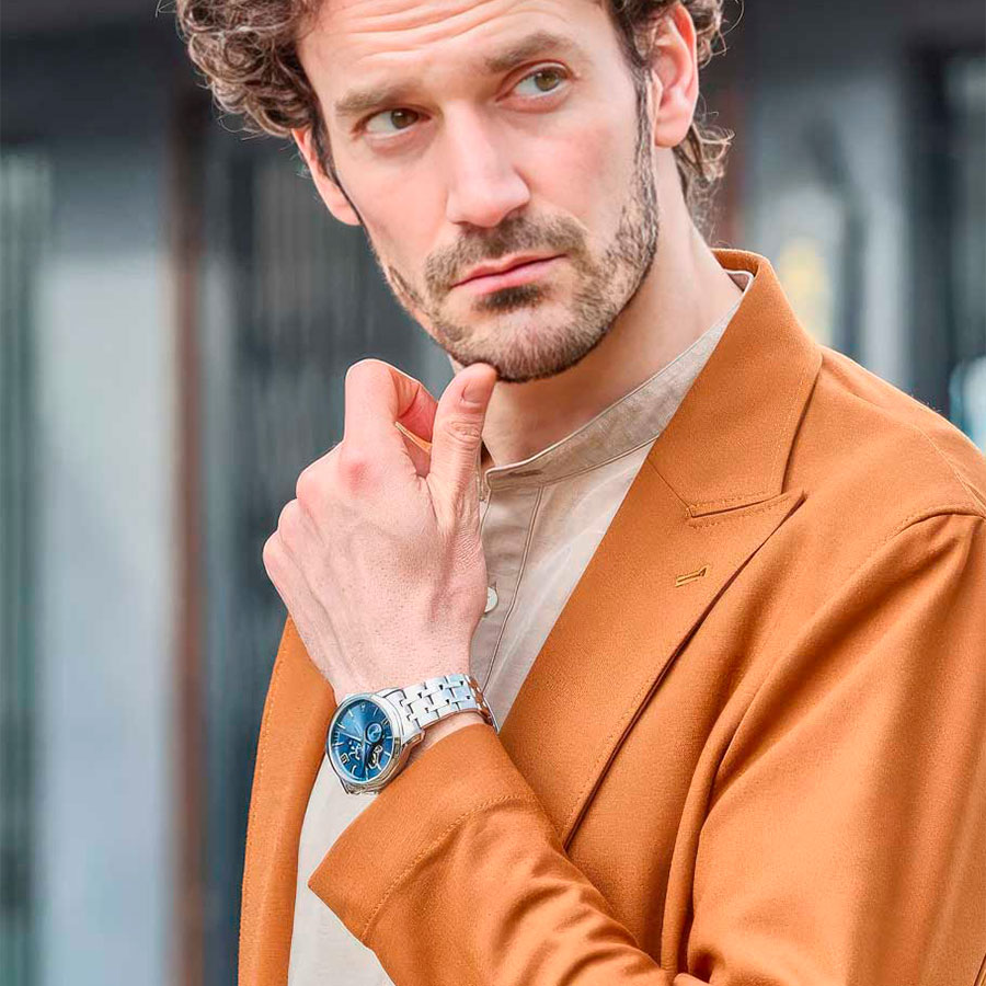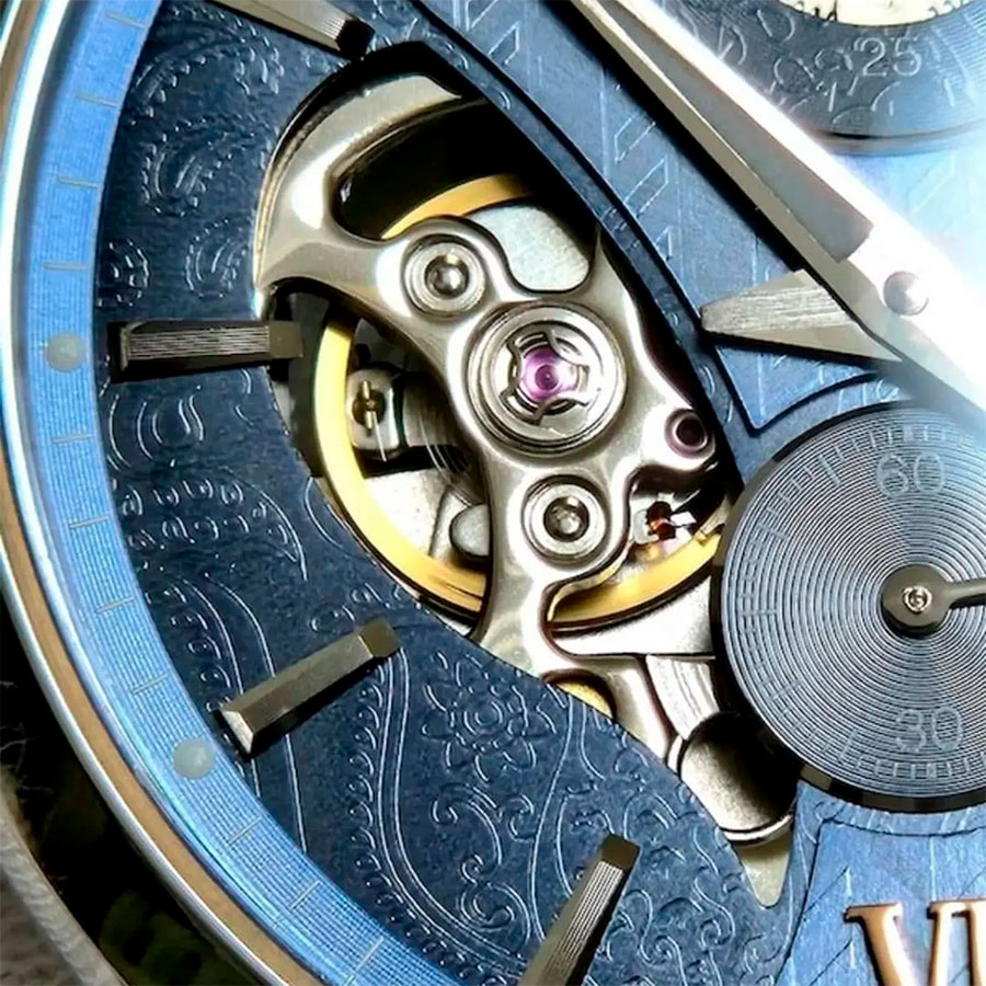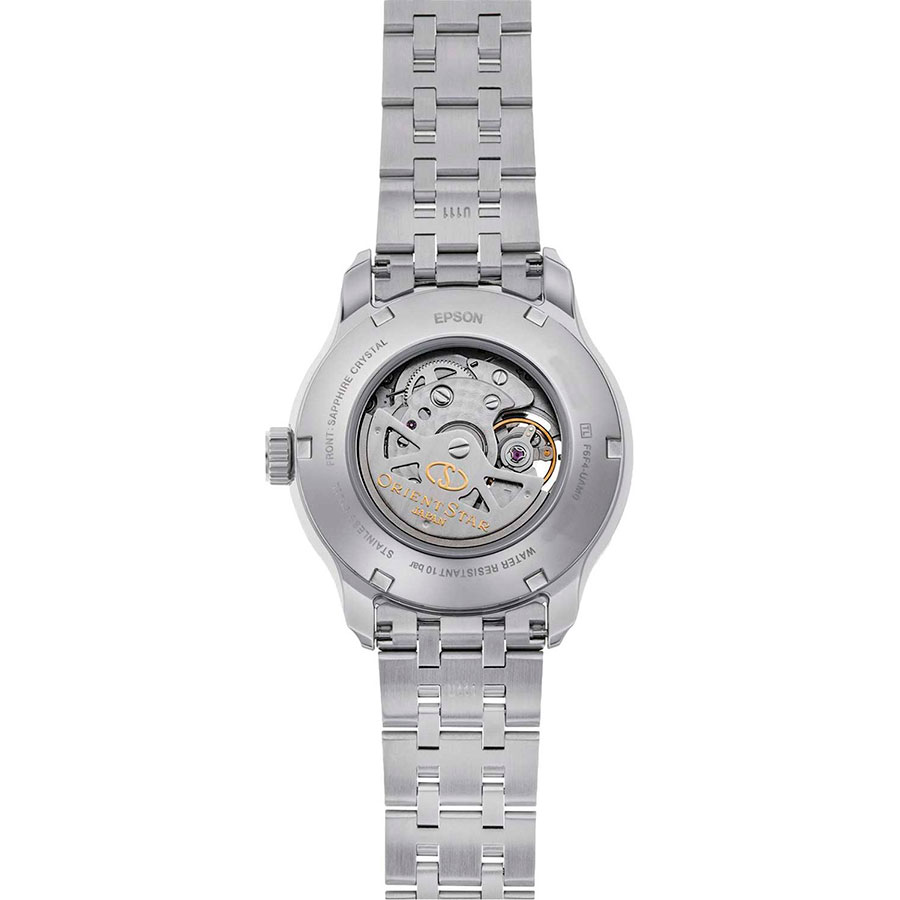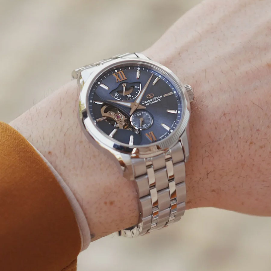 Мужские механические наручные часы с автоподзаводом и возможностью ручного завода Orient Star RK-AV0B08L коллекции Contemporary. Многослойный каркас украшен двухслойным циферблатом с мотивами из костюмной ткани. Циферблат верхнего слоя, представляющий внешний материал костюма, выполнен с рисунком в елочку, в то время как циферблат нижнего слоя украшен узором в виде пейсли с отливом, напоминающим подкладку из меди. Контрастные ткани придают уникальный акцент общему виду часов. Полукостюмное отверстие на циферблате выполнено в форме пейсли, а ажурный дизайн индикатора запаса хода также раскрывает внутреннюю работу механического механизма. Ощущение глубины в сочетании с текстильными узорами создает привлекательный образ. А мягкие изгибы ушек напоминают ямочку от галстука или драпировку ткани. Слегка отличающиеся дымчато-голубые тона новых моделей подчеркивают каждый слой и придают красочный акцент металлическому ощущению циферблата. Это идеальные часы для современного делового человека, который придерживается повседневного стиля и хочет выразить свою индивидуальность. Калибр механизма — F6F44. Запас хода не менее 50-ти часов. 21 600 полуколебаний в час. Количество камней - 24. На циферблате установлен ретроградный индикатор запаса хода, а так же на циферблате расположено прозрачное окошко, через которое частично видно работу механизма. Стрелки и метки покрыты люминесцентным напылением (светятся в темноте). Функция стоп-секунда (остановка секундной стрелки для установки точного времени). Элементы корпуса отполированы вручную по технологии Zaratsu. Прозрачная завинчивающаяся задняя крышка. Установлено устойчивое к царапинам сапфировое стекло с антибликовым покрытием. Водонепроницаемость WR100 (10 атм). Японская сборка (Made In Japan).