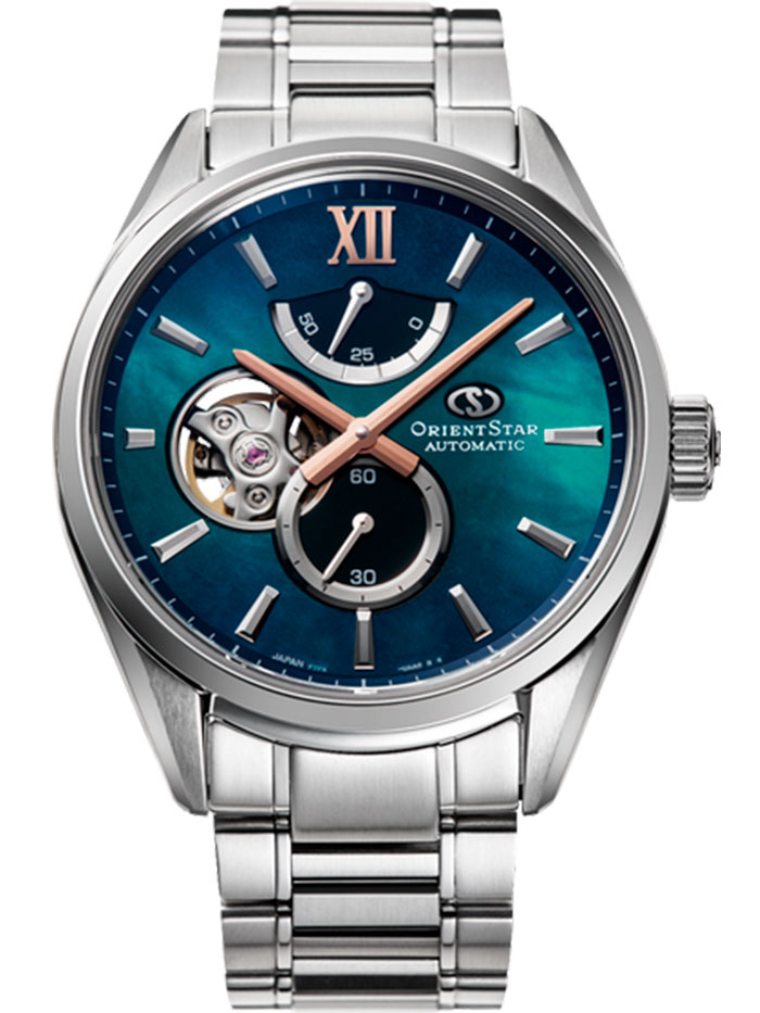 Мужские механические наручные часы Orient Star RK-BY0001A коллекции M34 F7 Semi Skeleton с автоподзаводом и возможностью ручного завода. Коллекция M34, названная в честь звёздного скопления в созвездии Персея, отличается инновационным дизайном цветовой палитры, материалами и отделкой, но при этом сохраняет базовый дизайн Orient Star. Из Персея ежегодно исходит метеорный поток, и, подобно метеорам, проносящимся по ночному небу, коллекция M34 отличается чётким, смелым и выразительным дизайном, придающим ей современный вид. Калибр механизма — F7F44. Запас хода более 50-ти часов. 21 600 полуколебаний в час. Количество камней - 24. На циферблате установлен ретроградный индикатор запаса хода. На циферблате расположено прозрачное окошко, через которое частично видно работу механизма. Функция стоп-секунда (остановка секундной стрелки для установки точного времени). Установлено устойчивое к царапинам сапфировое стекло с суперантибликовым покрытием (SAR). Элементы корпуса отполированы вручную по технологии Sallaz. Прозрачная завинчивающаяся задняя крышка. Японская сборка (Made In Japan). Водонепроницаемость WR100 (100 атм).