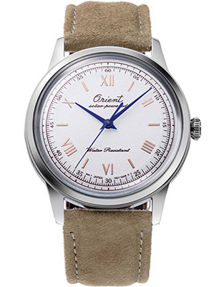 Мужские кварцевые наручные часы на солнечной батарее Orient Bambino RA-WK0006S из коллекции Classic — это лимитированная модель, выпущенная в количестве 750 экземпляров в честь 75-летия бренда Orient. Часы выполнены в винтажном стиле, отражающем историю и традиции марки, включая логотип Orient 1950-х годов, написанный курсивом. Белый циферблат с синими стрелками и бежевый ремешок из нубука подчёркивают ретро-характер модели.