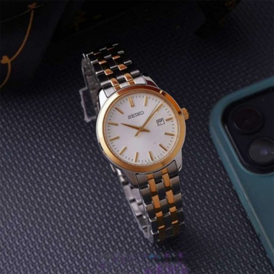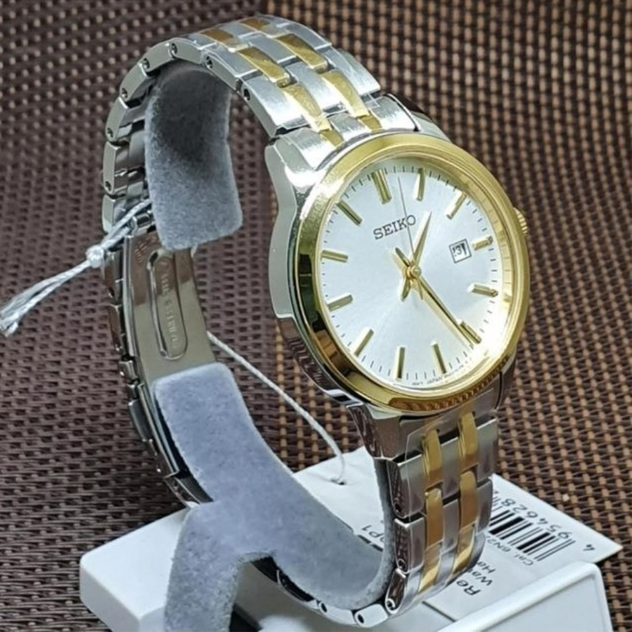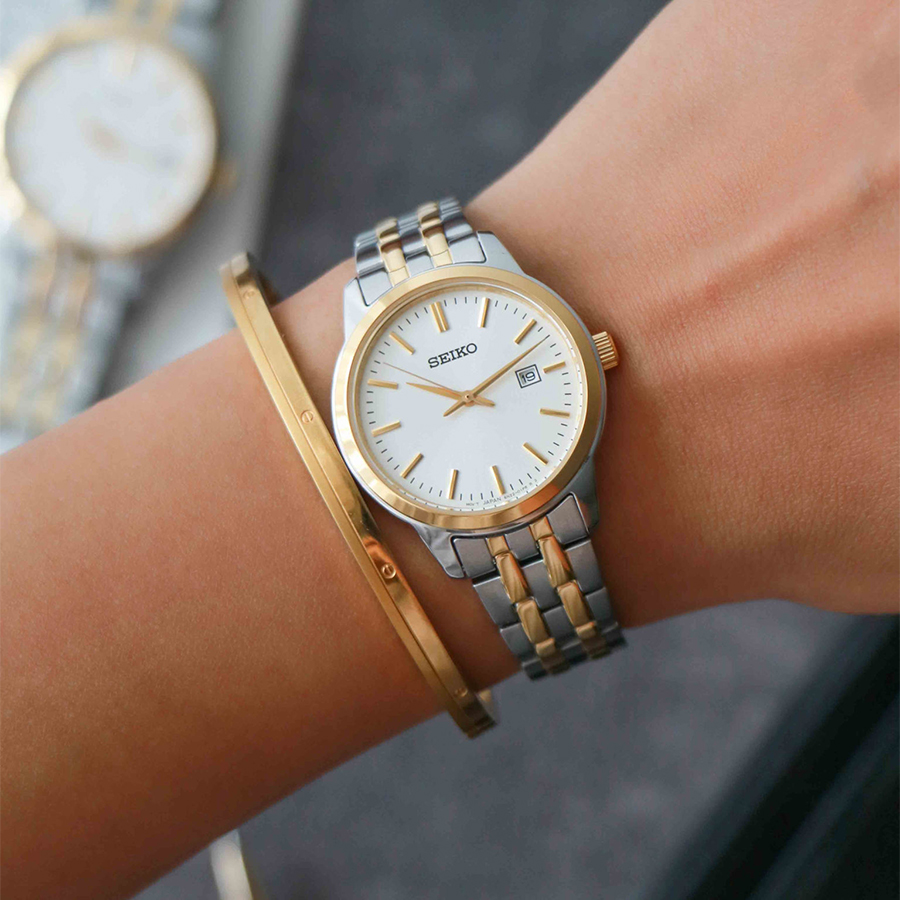Женские кварцевые наручные часы Seiko SUR410P1 коллекции Discover More. Калибр механизма — 6N22. На данной модели отображается текущая дата. Установлено минеральное стекло повышенной прочности Hardlex Crystal. На корпус и браслет частично нанесено стойкое PVD покрытие. Водонепроницаемость WR50 (5 атм).